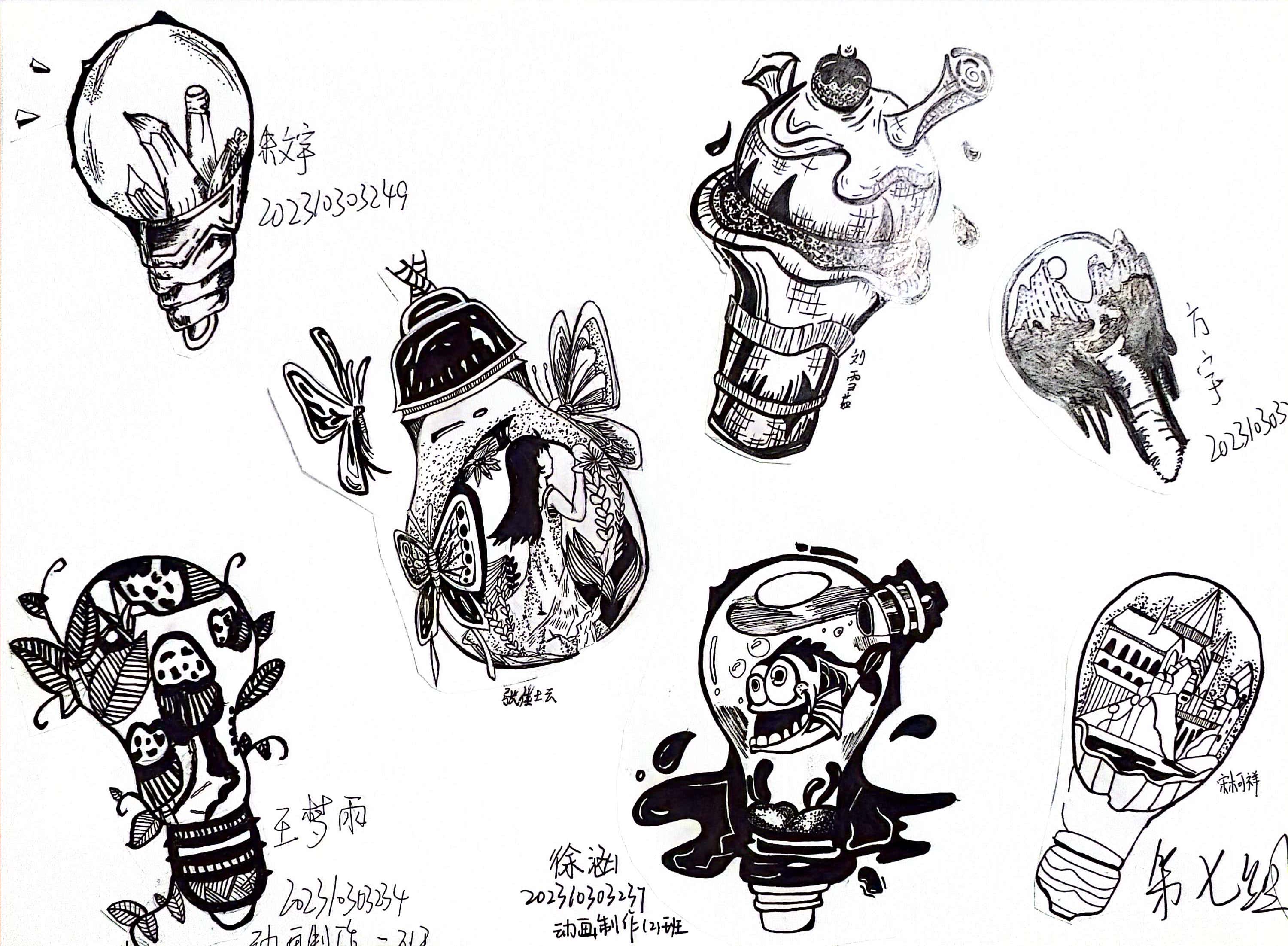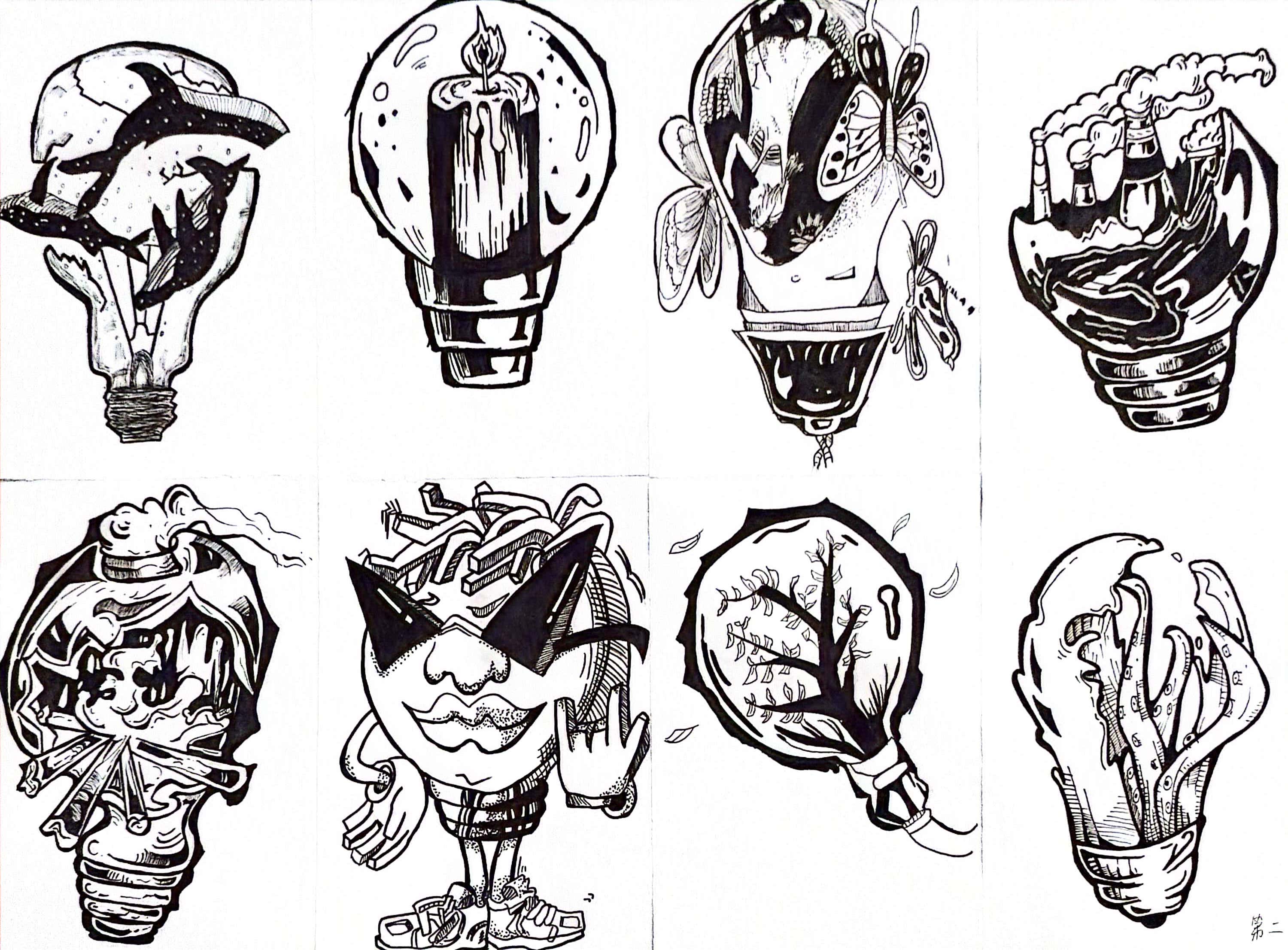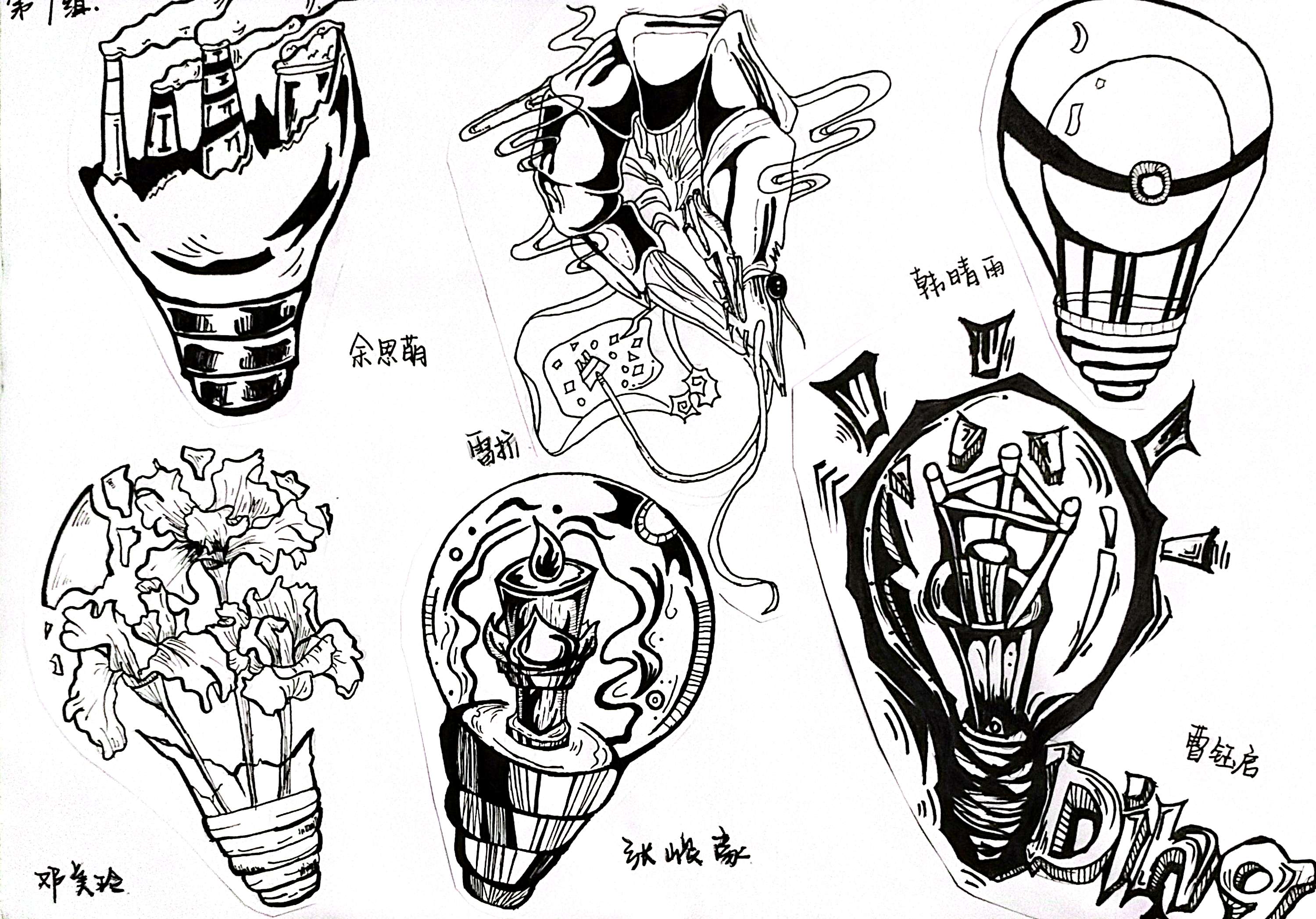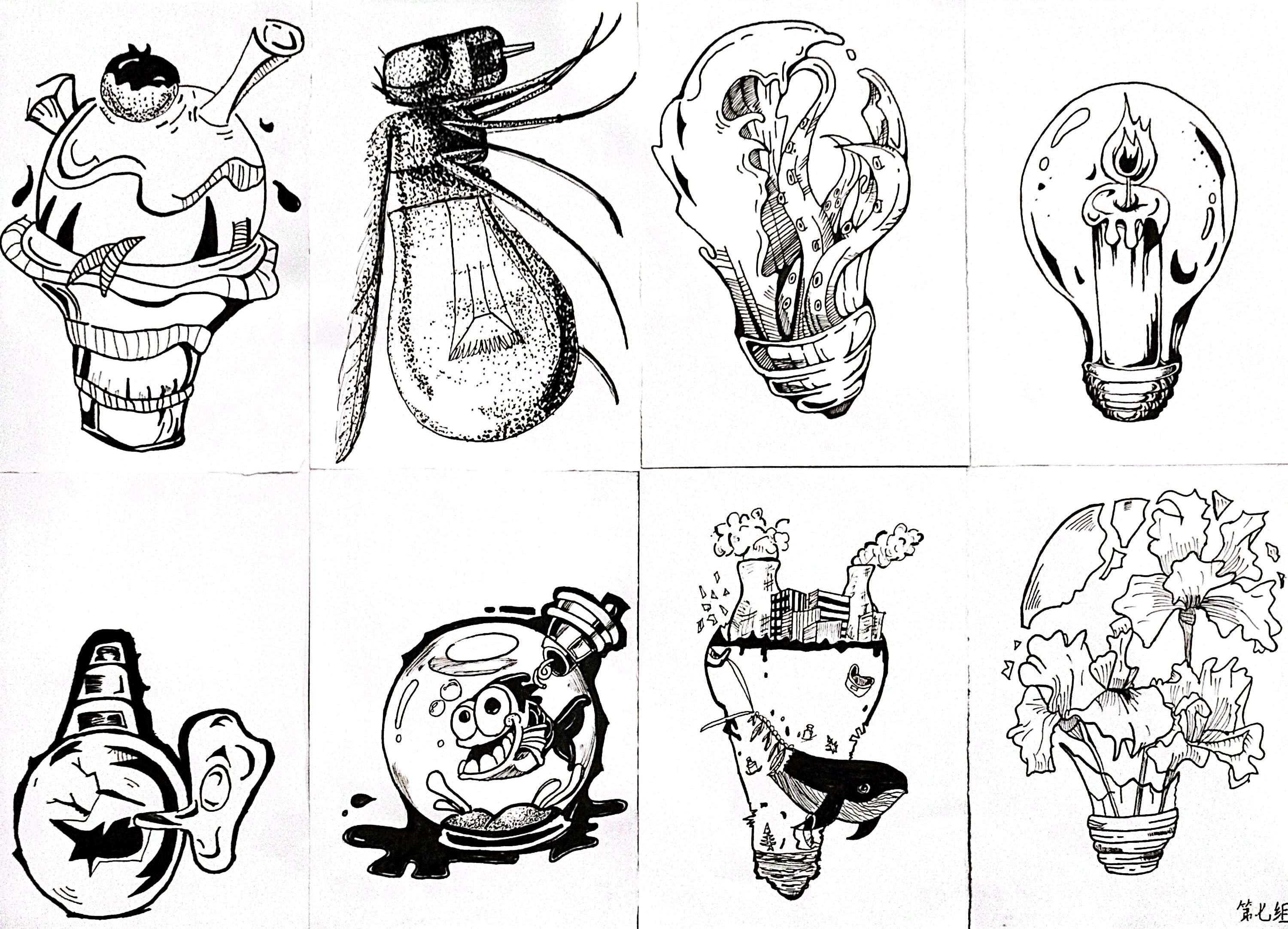 同构创意图形是指将两个或两个以上不同物体的材质进行替换、嫁接、拼凑,从而创造出形象统一,含义丰富的图形。学生将“灯泡”、“书”、“植物”、“留声机”用同构的表现手法,以小组为单位,每人画一个造型,创作一幅作品,以下是每个班级优秀作业展示: