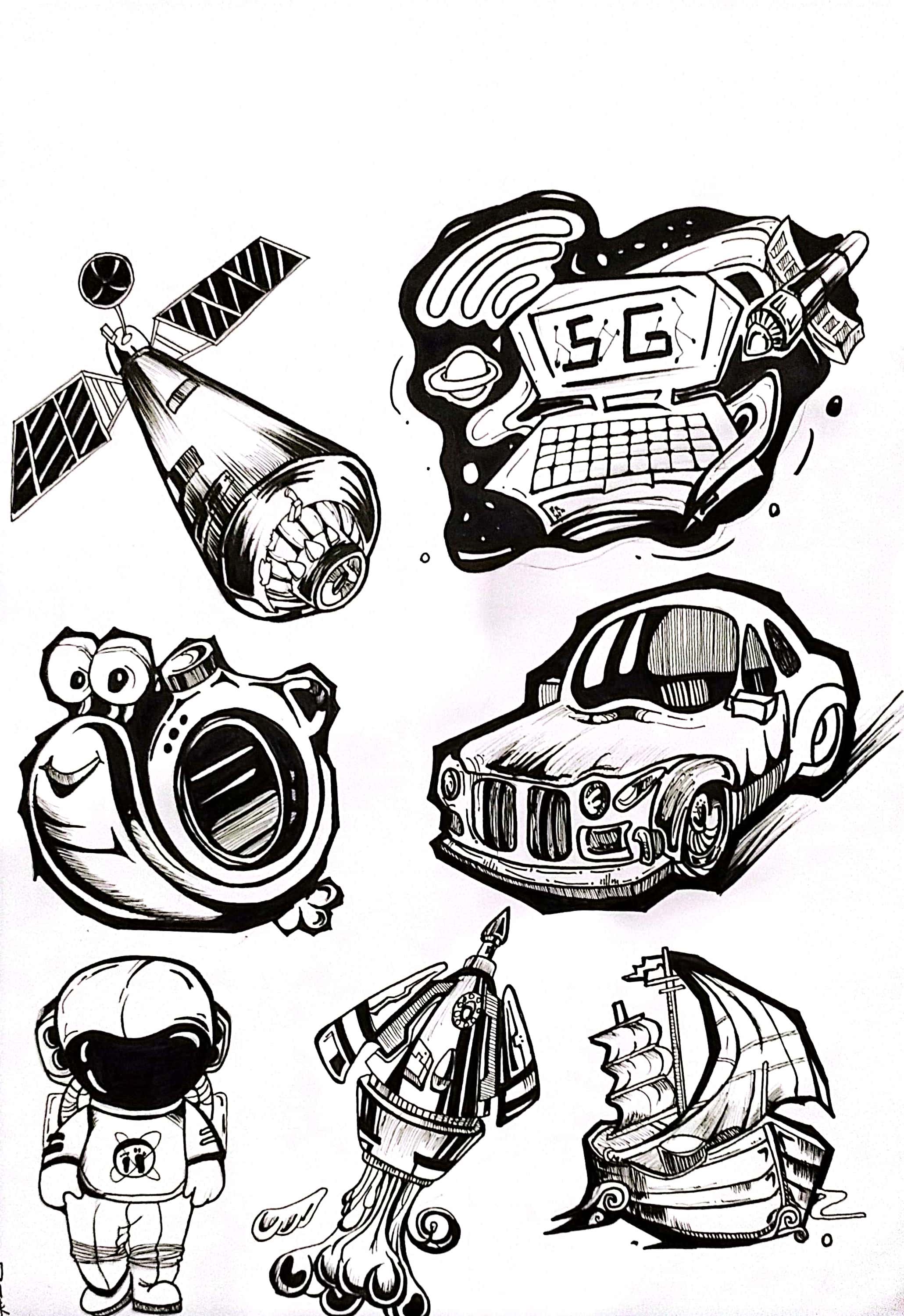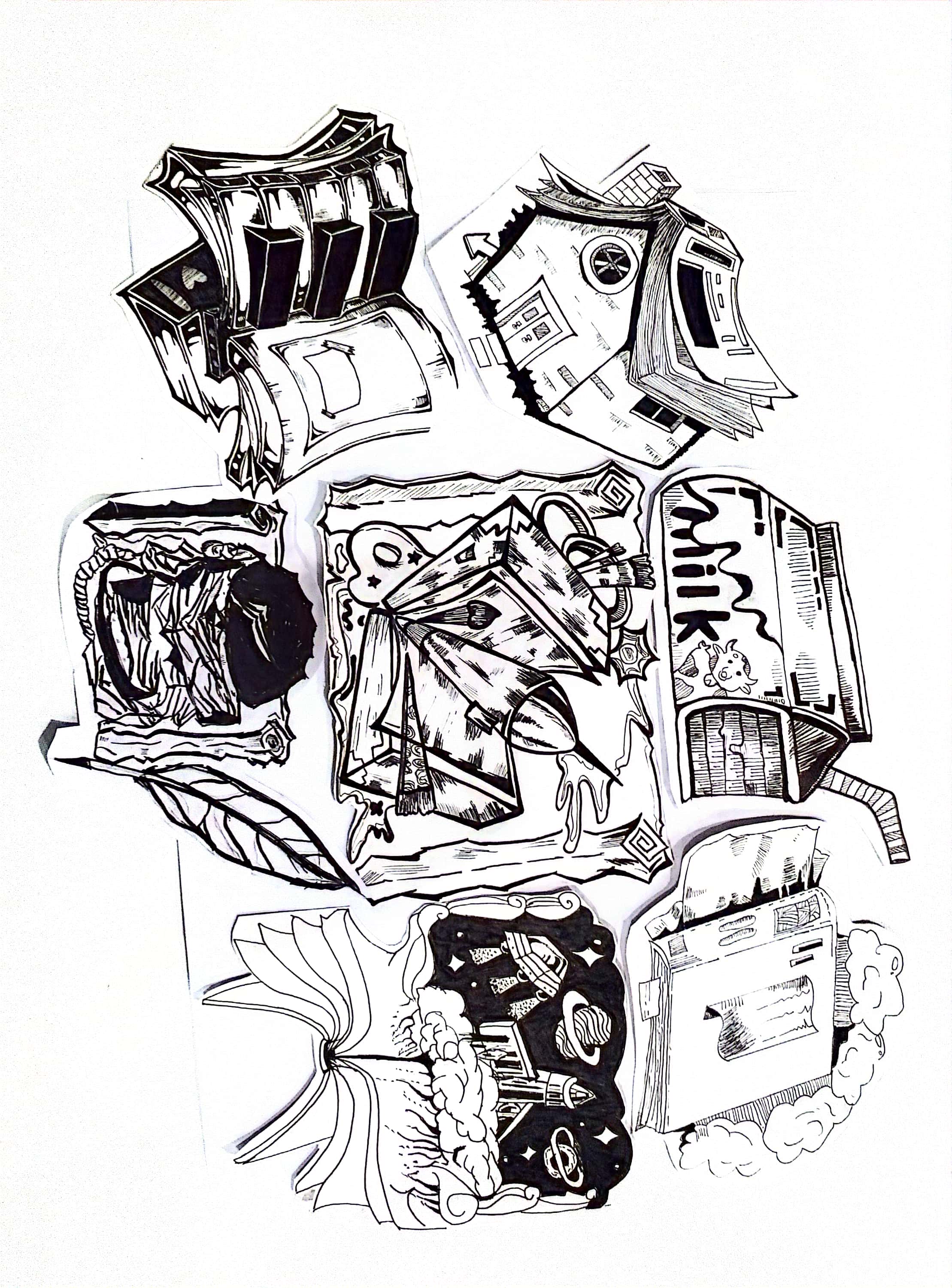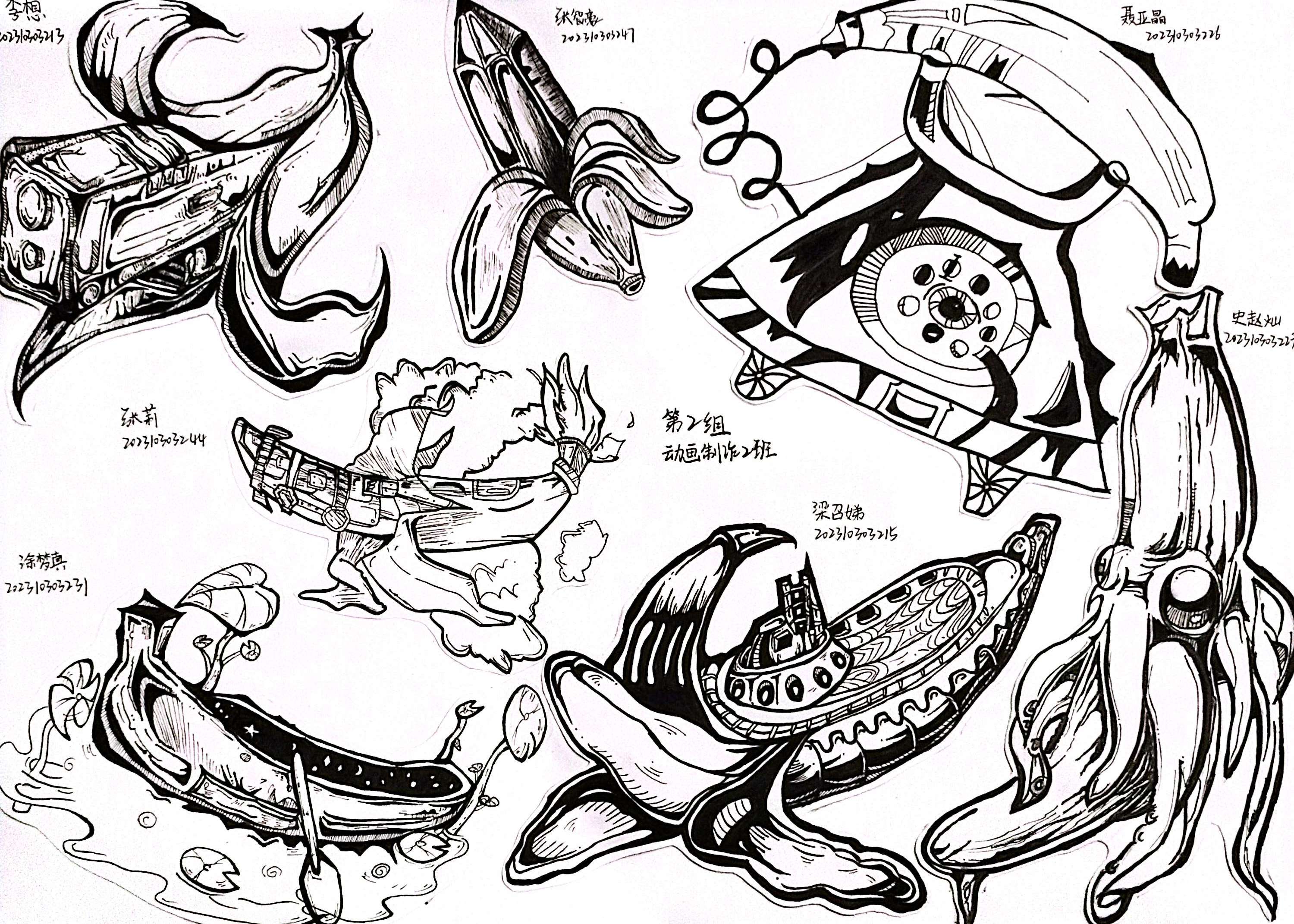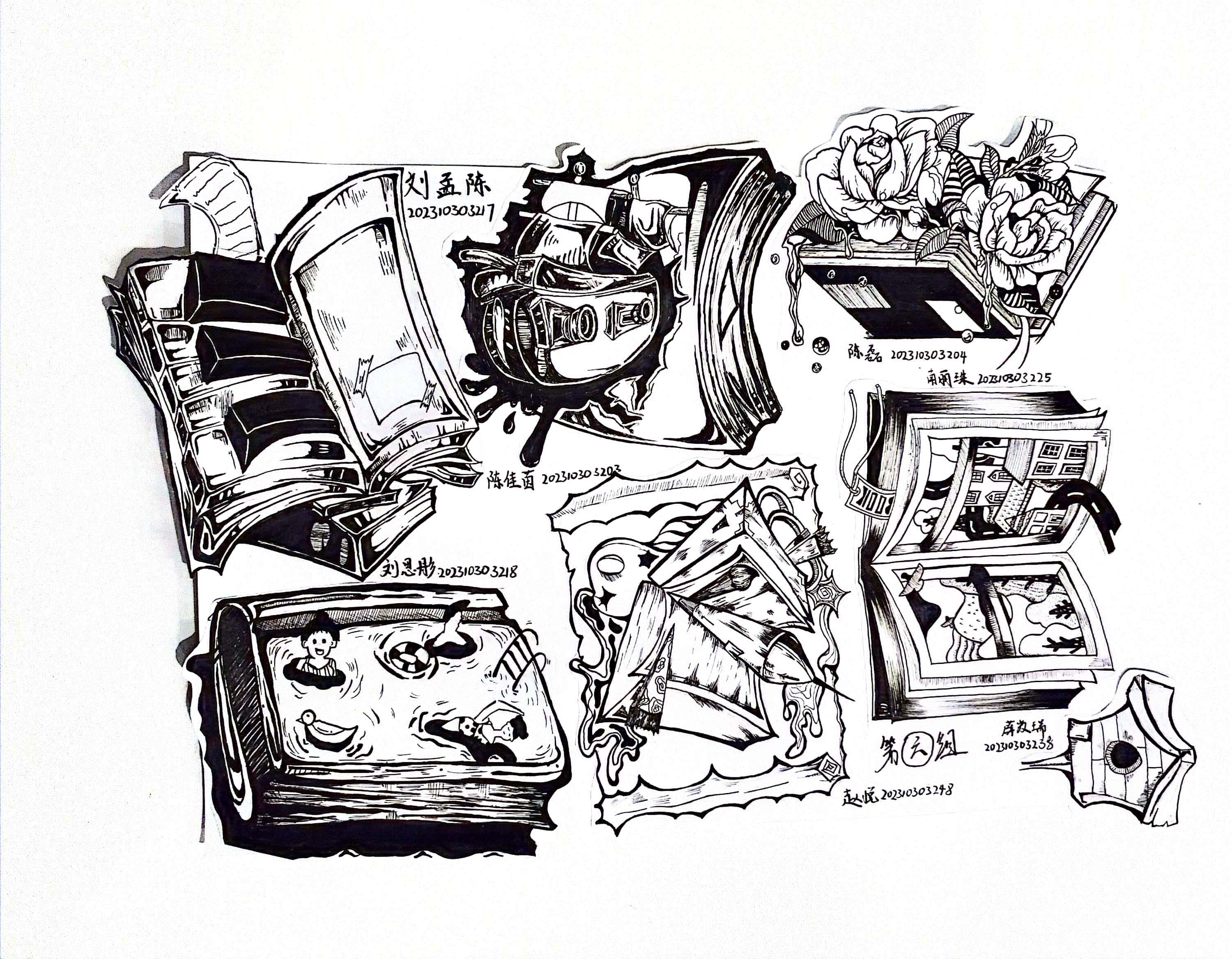同构创意图形是指将两个或两个以上不同物体的材质进行替换、嫁接、拼凑,从而创造出形象统一,含义丰富的图形。学生将“灯泡”、“书”、“植物”、“留声机”用同构的表现手法,以小组为单位,每人画一个造型,创作一幅作品,以下是每个班级优秀作业展示: