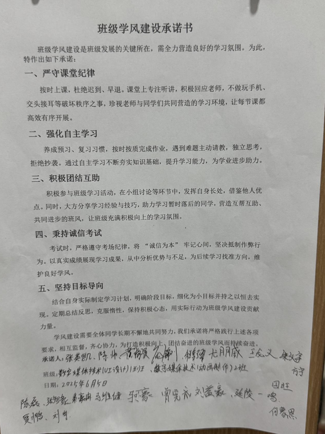 为持续深化新时代高校学风建设工作,营造良好学习氛围。近日,传媒学院辅导员李克森组织班级全体同学,在朝新楼101教室召开“明德笃行·创优学风”主题班会。班会紧扣学风建设核心命题,系统探讨学风提升路径与举措,为培育高素质传媒人才筑牢根基。 班会伊始,李克森对班级学习现状进行剖析,指出大二是专业能力提升的关键期,虽整体学习劲头足,但部分同学存在实践参与度不足、理论知识掌握不扎实等问题,希望借此次班会激发学习主动性。随后,同学们围绕 “严守纪律、勤思善学、实践创新、诚信应考、锚定目标” 展开热烈讨论。讨论结束后,全体同学签署《班级学风建设承诺书》,从规范课堂纪律、强化自主学习、积极投身实践、恪守考试诚信等方面作出承诺。 班会最后,李克森作总结发言。她强调,学风是班级建设的核心,关乎每位同学成长。全体同学要以承诺书为指引,将学习计划落到实处,做到知行合一;同时发挥“传帮带”小组作用,促进同学间互帮互学、共同进步。此次班会为学院学风建设注入动力,助力传媒学子在成长道路上迈向新高度。 审核:石冰清 初审:宋晓焱 编辑:李克森 排版:李思莹