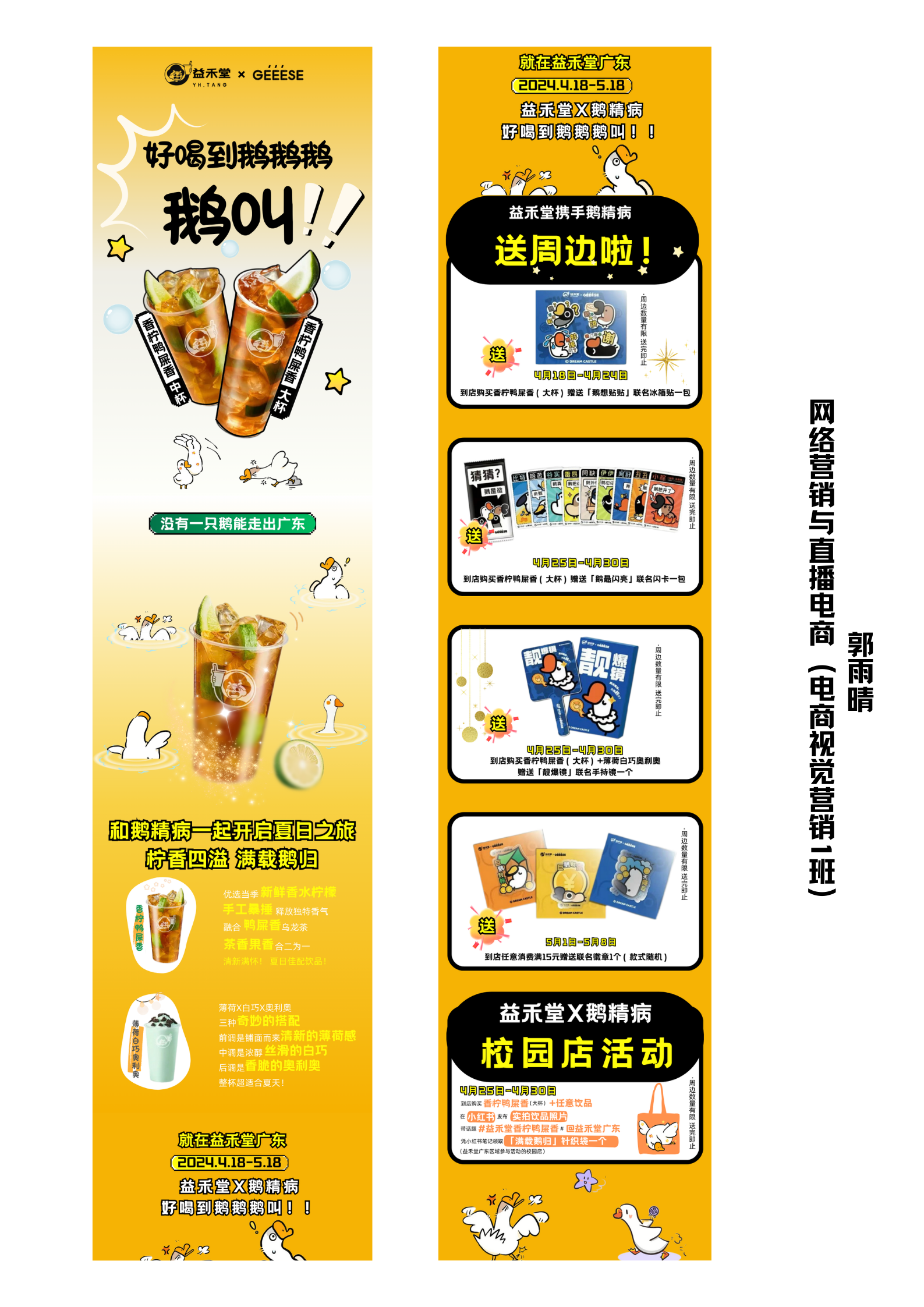 本次展出的系列品牌产品海报与长图,是从学生课堂作业中筛选的较为优秀的作品,作品涵盖了库迪、瑞幸等饮品品牌,小米等科技产品,以及微信读书、京东金融APP等应用,风格多样,创意十足。学生们在缺乏Photoshop等专业软件基础的情况下,利用Canva、创客贴等基础在线设计工具,通过模仿与创新,将课程中学到的品牌认知、卖点提炼、活动策划、场景塑造等理论知识灵活应用于海报创作中,这些海报不仅锻炼了学生们的产品信息提炼能力,还考验了他们的文图排版、色彩搭配与元素选择技巧。