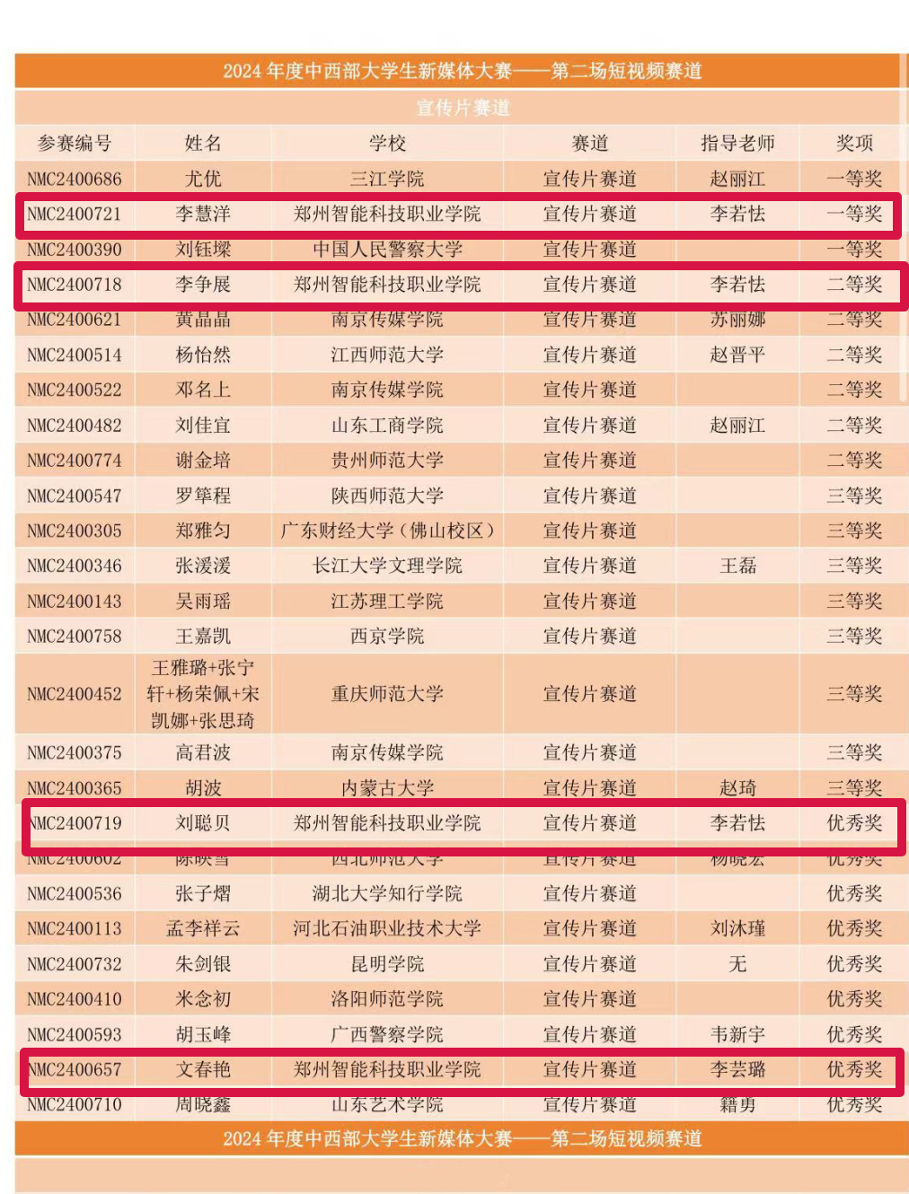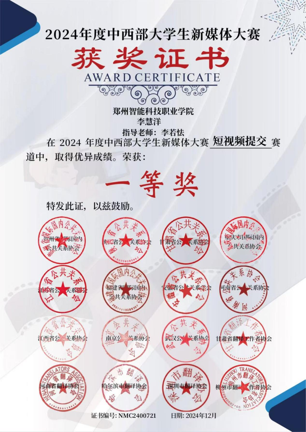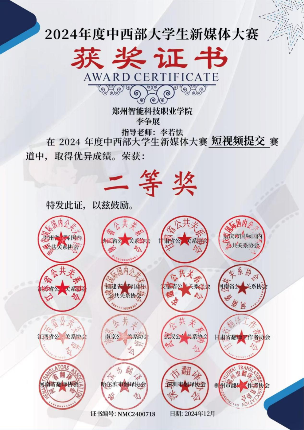 近日,2024年度中西部大学生新媒体大赛圆满落幕。我们传媒学院学生李慧洋、刘佳萱等同学制作的宣传片《面》荣获短视频组一等奖;李争展、刘颖等同学制作的宣传片《陶瓷匠心》荣获短视频组二等奖;刘聪贝、寇雨欣等同学制作的宣传片《文物秘语》获得短视频组优秀奖;汪天顺、朱炳旭等同学制作的纪录片《郑州印象之登封》获得纪录片组优秀奖;文春艳、赵兴怡等同学制作的宣传片《清明上河园》荣获短视频组优秀奖;李若怯、李芸璐荣获优秀指导教师奖。 这些荣誉的获得,体现了我们传媒学院“先行后知”教学理念,学院大力落实“做中学、学中做”的项目制双创教学体系,推行自主学习模式初显成效。在今后工作中,我们将持续深化校企合作、产教融合,优化人才培养模式,将“以赛促学、以赛促教、以赛促改、以赛促建”融入课程,搭建实践教学平台,助力学生在比赛中锻炼提升,实现学以致用、知行合一。