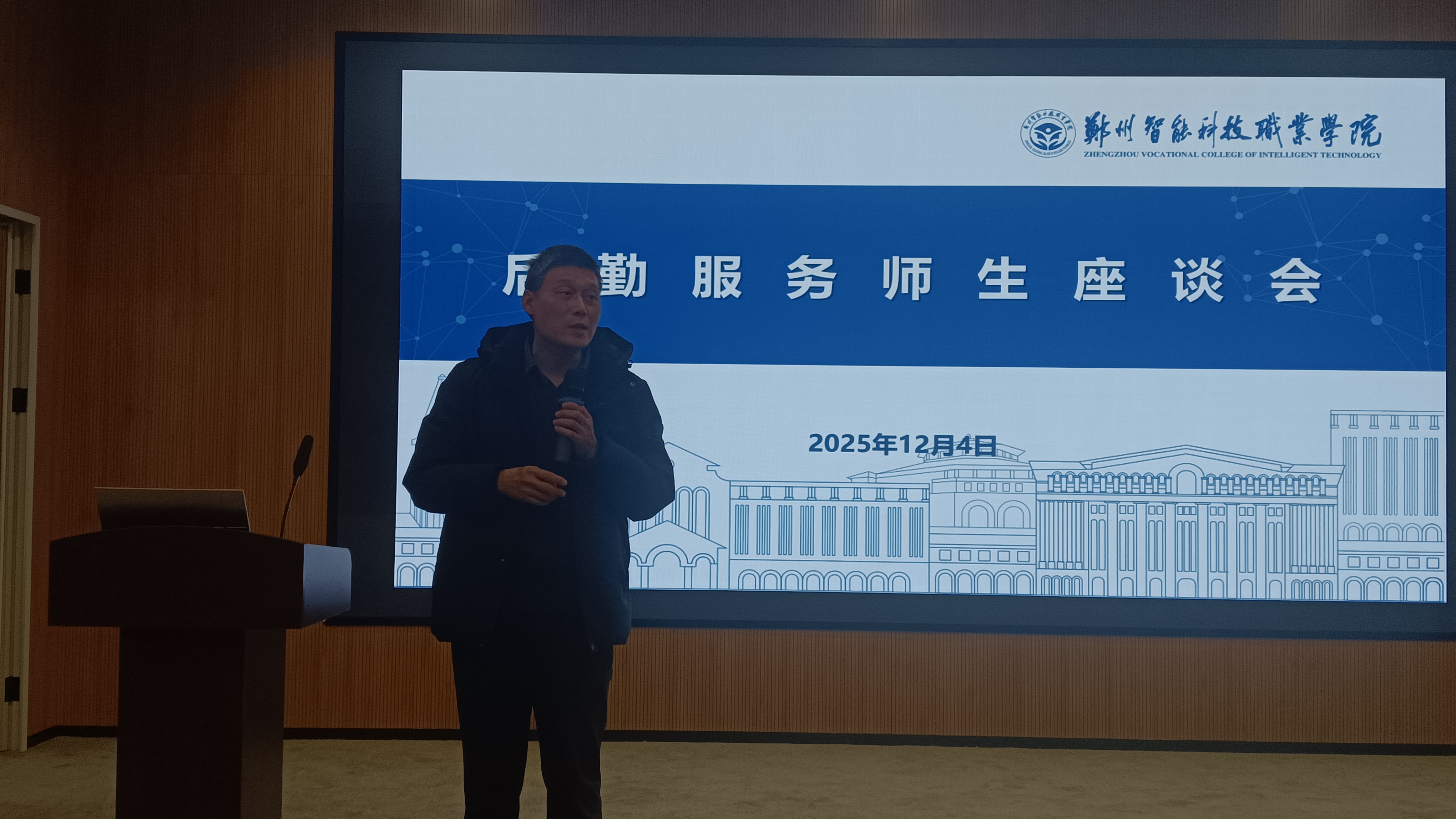 座谈会上,后勤保卫处副处长赵旭锋介绍了近期餐饮、水电保障、维修服务等方面的情况。师生代表就日常学习生活中关心的问题提出了宝贵意见和建议。