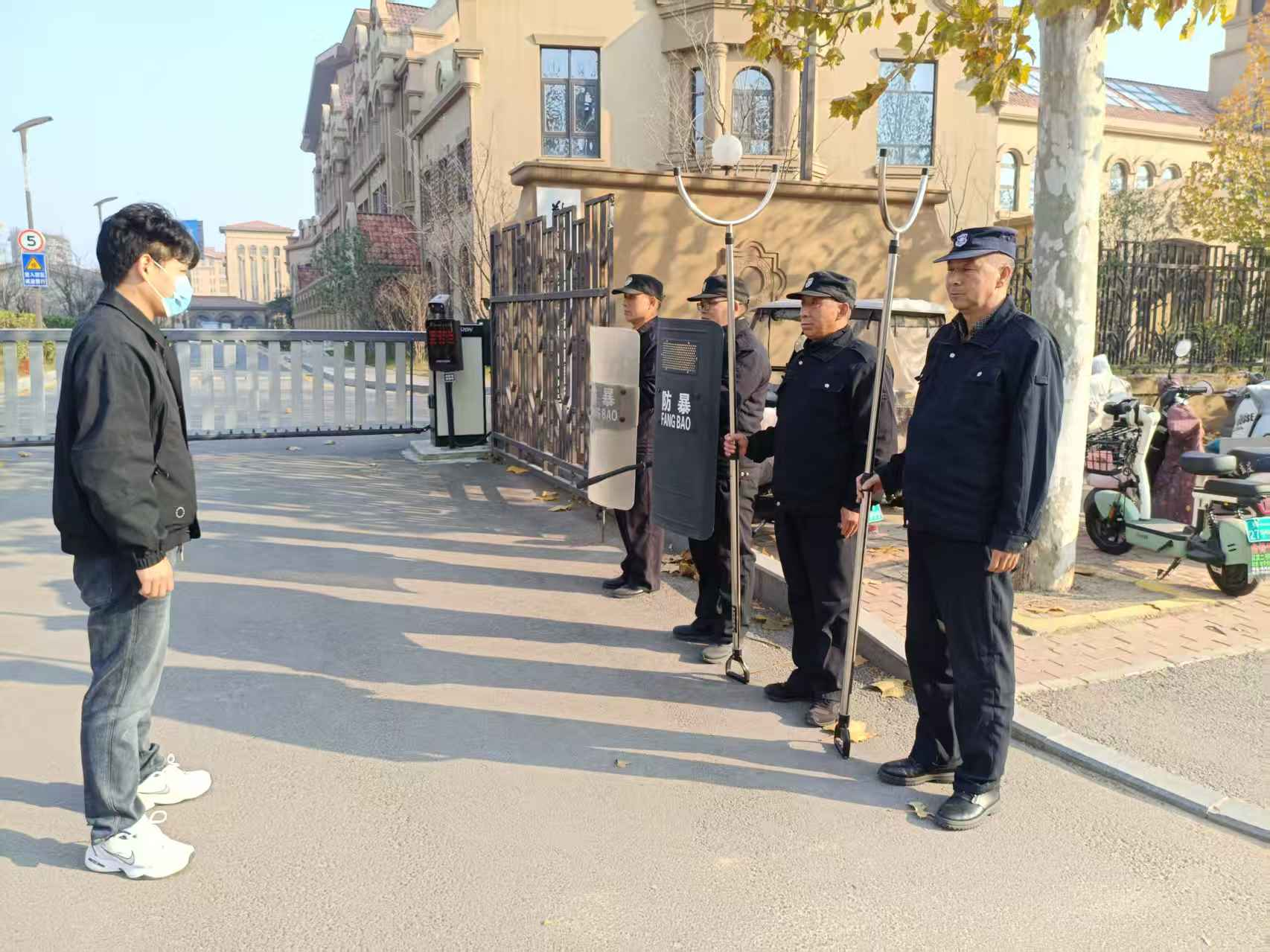 演练模拟一名“可疑人员”携带危险物品试图闯入校园,西门安保人员发现后,立即按预案启动应急响应:迅速发出警报,手持防爆器械形成防护阵型,果断将“可疑人员”控制在安全区域,整个过程反应迅速、配合默契,达到了预期效果。