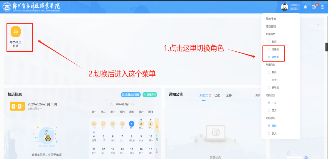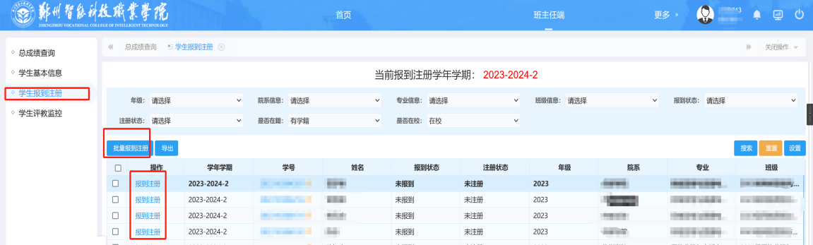 2022级、2023级学生应在学校规定的时间内,根据各学院要求,由辅导员登录教务管理系统,选择辅导员或班主任角色,进入“辅导员/班主任端”页面菜单,点击“学生报到注册”即可查询所辖班级学生报到注册状态办理报到和注册手续,报到注册不得由他人代为办理,不得批量进行注册,各辅导员要落实责任制,实行“谁操作谁负责”,严谨虚假注册带来安全隐患。