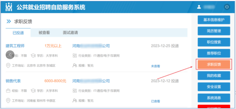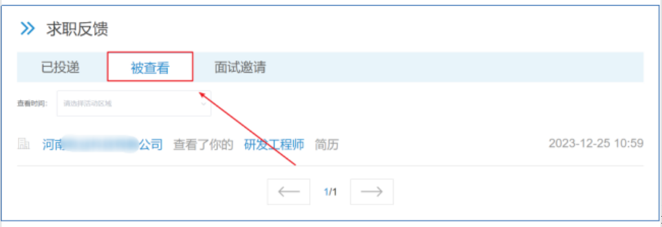 进入求职反馈页面,点击被查看页签,打开职位列表。 提示:该页面显示的是单位查看过投递职位的简历的职位列表。