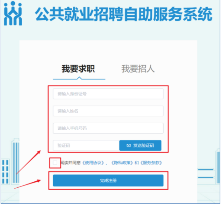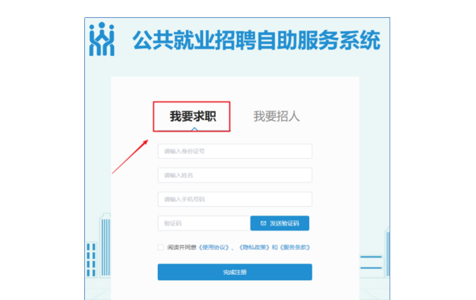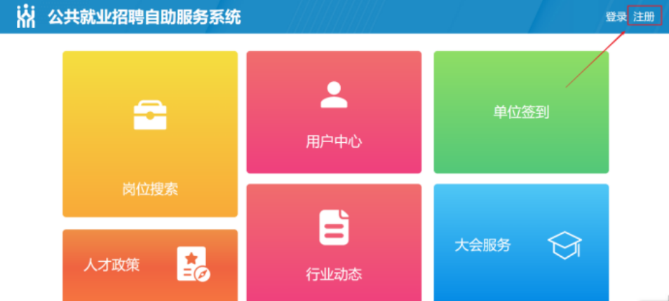 1.打开公共就业招聘自助服务系统点击右上角【注册】按钮,打开“公共就业招聘自助服务系统”注册页面。