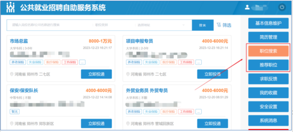第一步:进入个人中心,点击【职位搜索】/【推荐职位】菜单,进入职位列表。