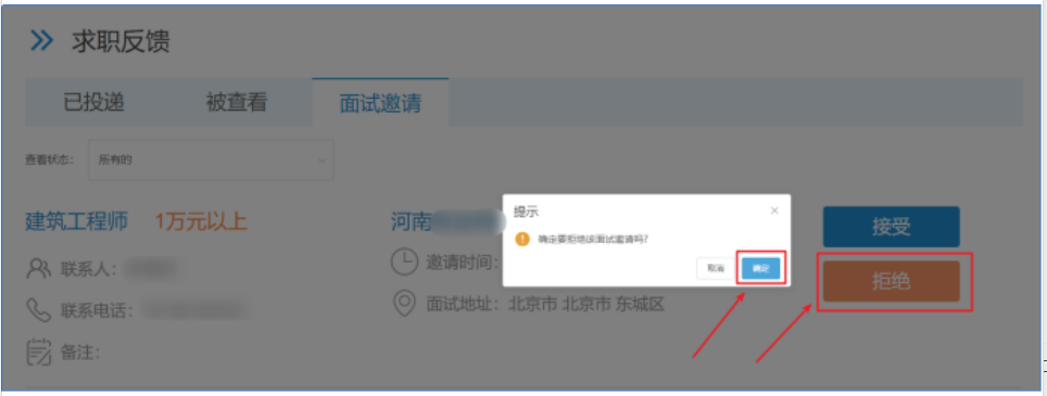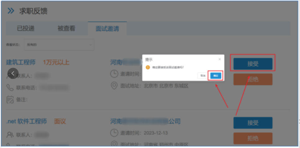 点击【接受】按钮,会弹出再次确定窗口,点击【确定】按钮,即可接受面试。