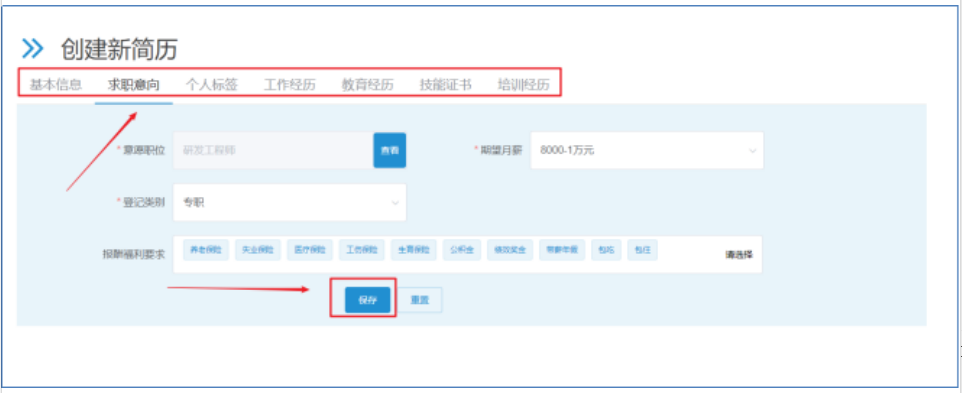 在创建简历页面,分别在【基本信息、求职意向、个人标签、工作经历、教育经历、技能证书、培训经历】页面填写相关信息(标红色*号的为必填项),点击【提交】按钮。