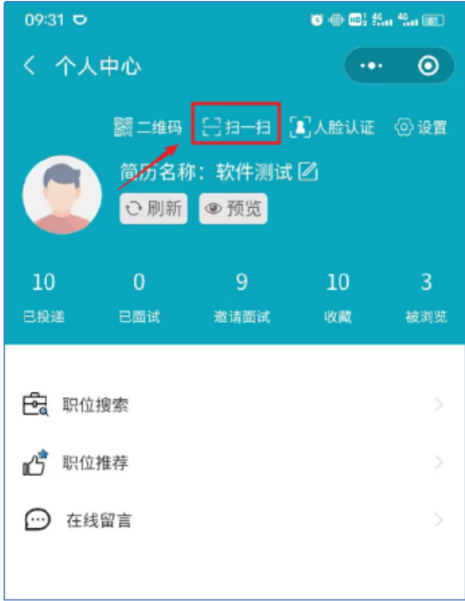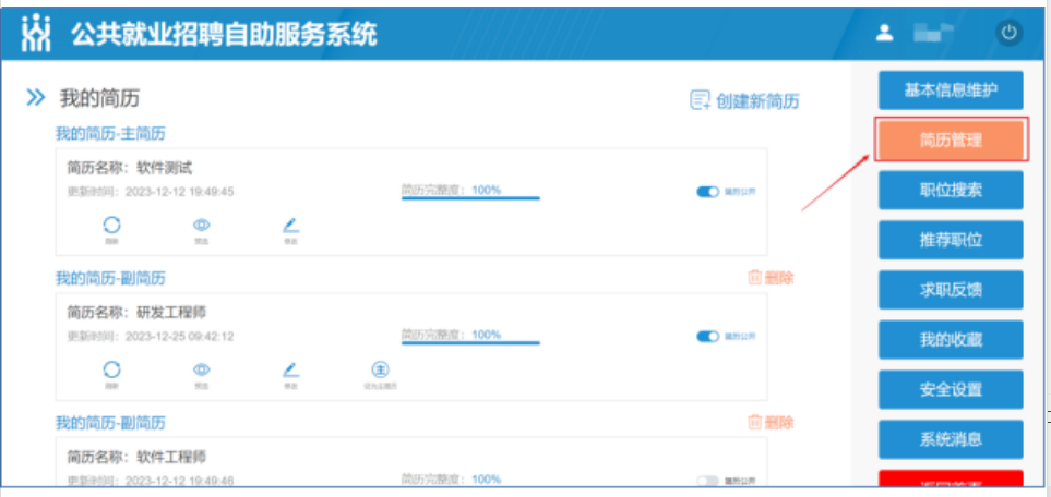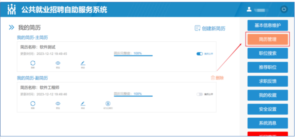 登录之后,跳转到个人中心,点击【简历管理】进入简历管理页面。
