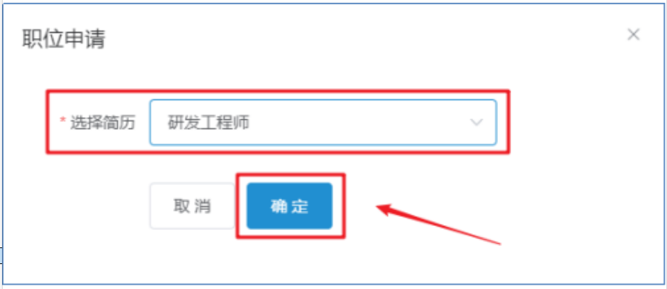 点击【立即投递】按钮后,会弹出选择简历弹窗,选择简历后,点击【确定】按钮,即可投递简历成功。