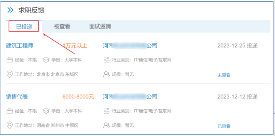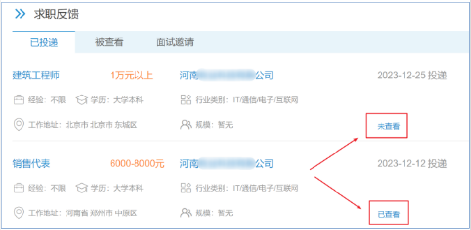 (2)图中右侧【未查看、已查看】显示的是被投递职位的单位是否查看简历的状态,如下图:
