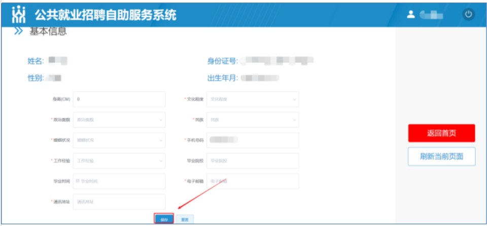 提示:个人用户注册后首次登录公共就业招聘自助服务系统时,会进入个人信息完善页面。完善信息后,点击【保存】按钮自动跳转个人中心。