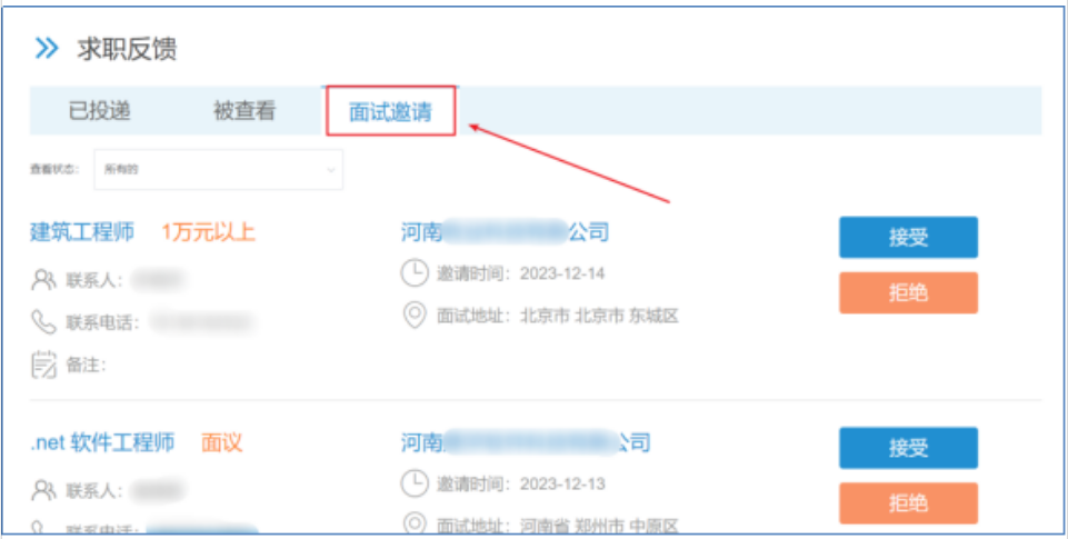 进入求职反馈页面,点击面试邀请页签,打开面试邀请列表。