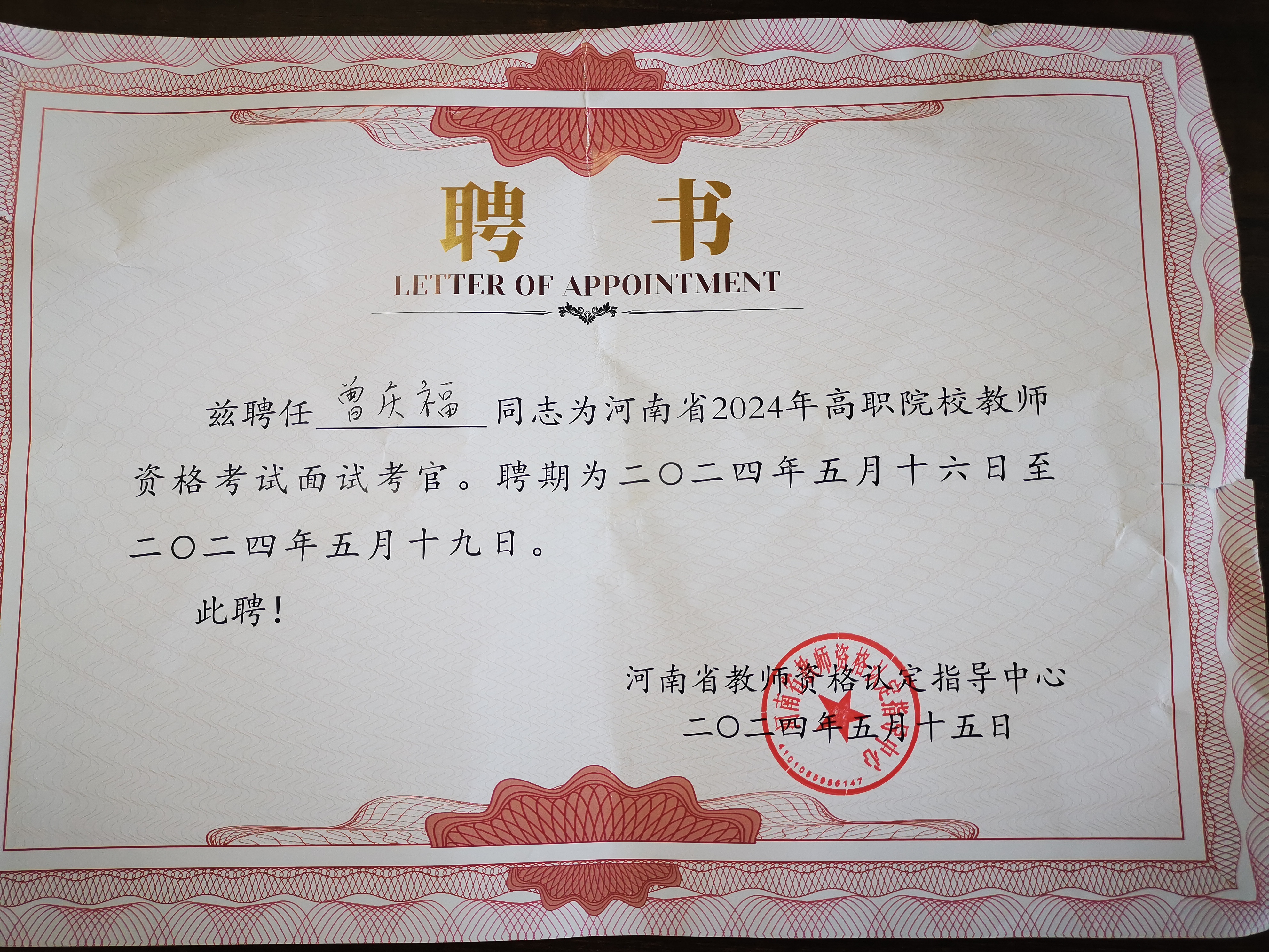 我们教师曾庆福教授受邀于2024年5月16-19日担任河南省2024年高职院校教师资格考试面试考官。