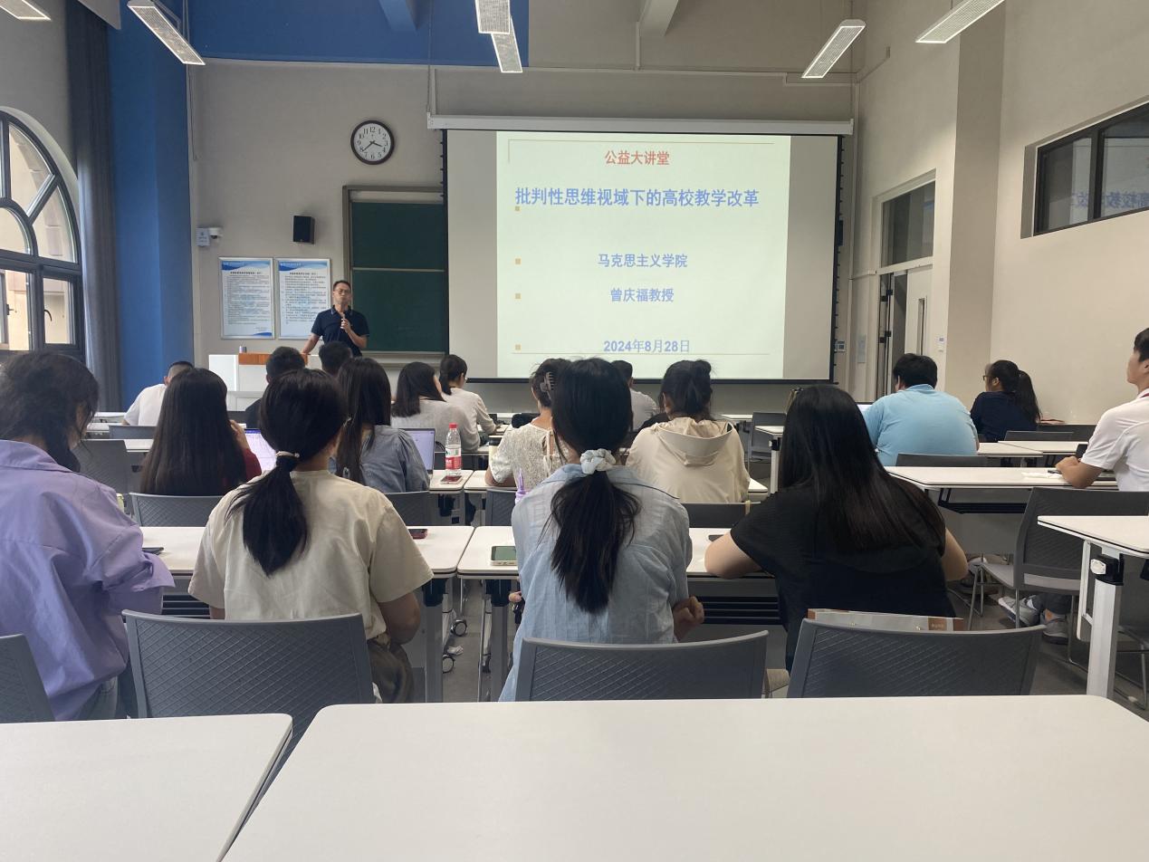 为了感恩学校,回馈社会,践行志愿者精神,弘扬社会主义核心价值观,我院面向全校师生和社会举办“公益大讲堂”系列讲座和活动。8月28日下午,“公益大讲堂”第一讲在学校朝新楼107教室开讲,本次讲座由我院院长曾庆福教授主讲,他讲座的题目是“批判性思维视域下的高校教学改革”。