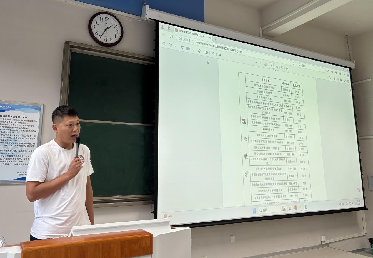 会上,四位参加不同暑期培训的教师进行了分享。首先,体育教师闫召介绍了他在黄淮学院参加的全省“双师型”运动训练专业培训经历。他从体育教学、运动训练和体育科研三个方面展开,重点分享了在实践培训中的心得体会详细介绍了自己在暑期培训中的所学所得。闫召老师特别强调了掌握体育科学前沿消息的重要性,并表示这些新知识将为今后的体育教学工作注入新的活力。