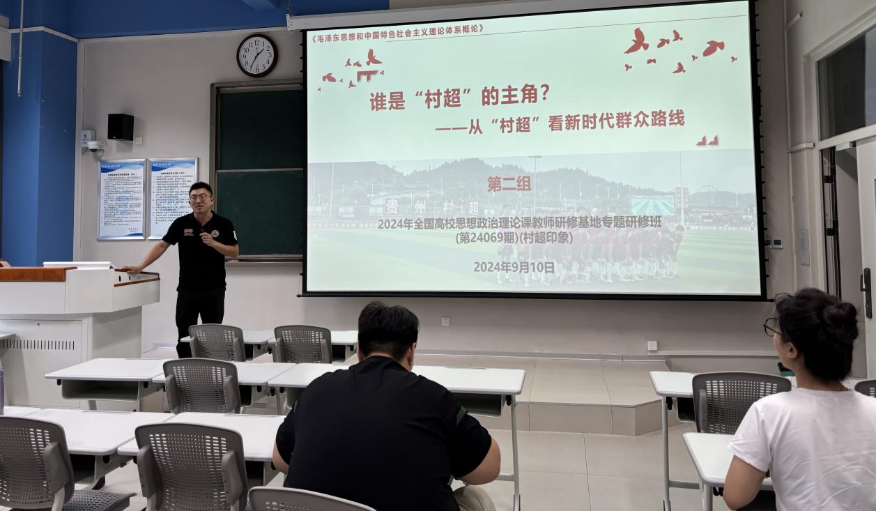 思政课教师侯超群分享了他在2024年全国高校思想政治理论课教师研修基地专题研修班的培训心得。他围绕“将案例教学融入思政课中”的主题,详细讲解了如何将贵州“村超”的案例融入群众路线的教学。他将贵州“村超”的案例巧妙地融入群众路线的教学中,从何谓群众路线、为何坚持群众路线、何以践行群众路线三个方面进行了深入剖析,并结合自己在培训期间的所见所闻,理论讲解生动有趣。侯超群老师的分享既有理论高度,又紧密联系实际,他还分享了培训期间的趣事、美食、美景以及当地的人文特色,使得整个分享生动有趣。