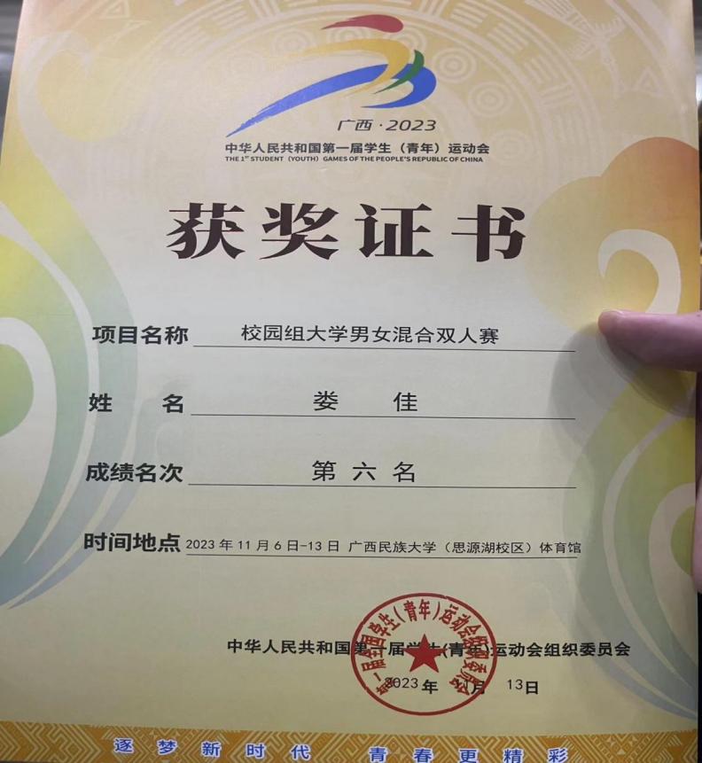 11月5日,我们学生娄佳同学在广西举办的全国第一届学生(青年)运动会毽球混双比赛中取得第六名优异成绩。娄佳同学系我们人工智能学院2022级计算机应用技术1班学生,此次代表我省参加毽球大学生组团体比赛和男女混双比赛,该项目涉及全国40多所高校,30多支代表队参加。在团体比赛中,我省毽球队先后以压倒性优势战胜江苏队和吉林队,后因娄佳同学在比赛中膝关节扭伤,最终伤势难支,团体赛止步六强。娄佳同学在此次运动会中表现出的追求更高、更快、更强的竞技精神,体现了我们学生的积极向上的精神风貌。