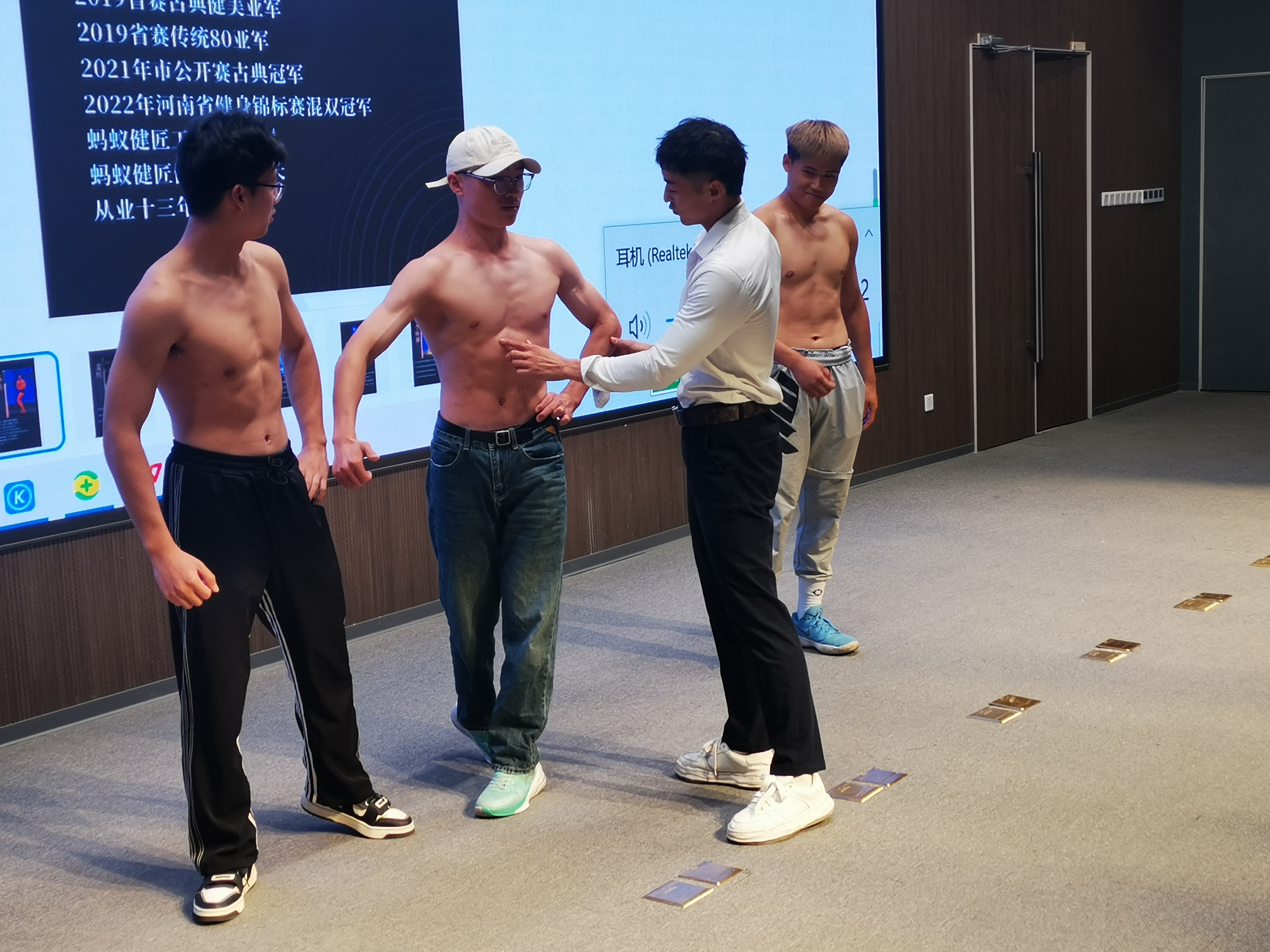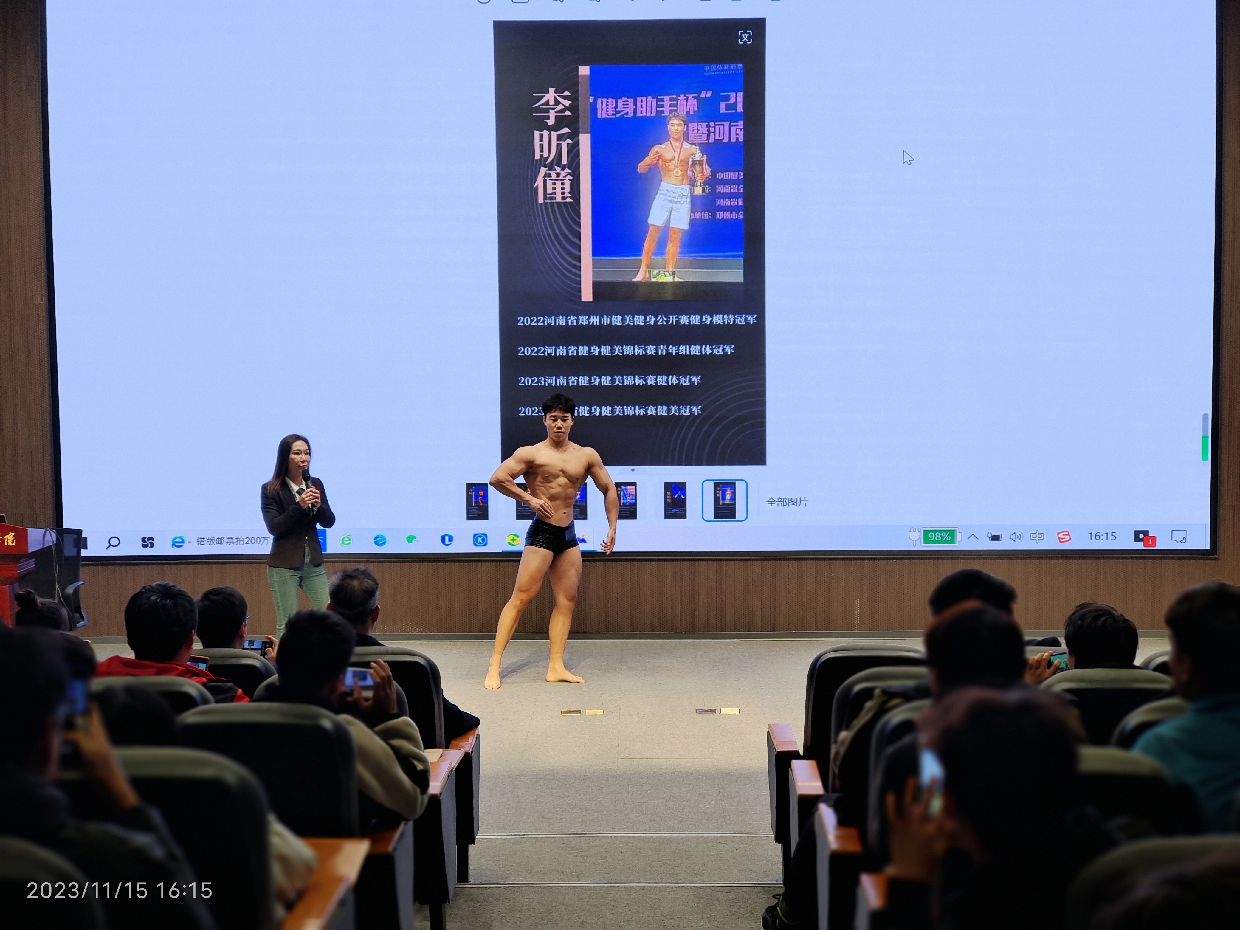 报告结束后,健美运动员分别进行了男子健美、健体、女子健身模特展示,健美的身材、优雅的气质,引起同学们啧啧赞叹,也让同学们得到力与美的享受。活动期间,健美运动员还对我们健美健身校队队员健美训练和比赛进行了现场指导和动作示范。