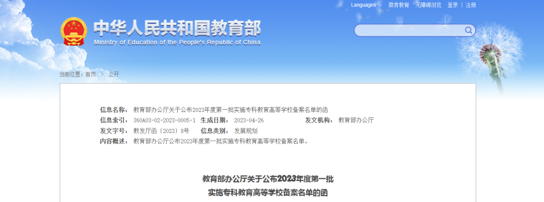近日,教育部网站发布了《教育部办公厅关于公布2023年度第一批实施专科教育高等学校备案名单的函》,公布省级人民政府审批设置的实施专科教育高等学校备案名单。