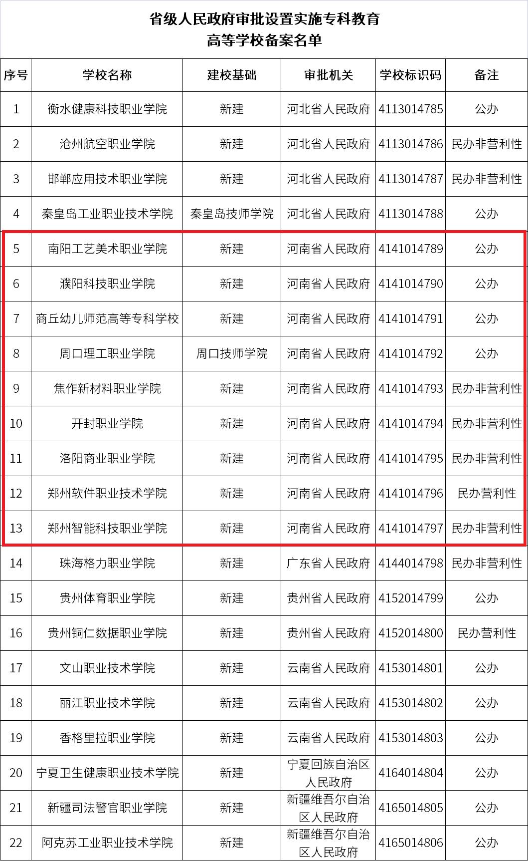 根据《中华人民共和国高等教育法》《普通高等学校设置暂行条例》等有关法律法规和政策文件的规定,现将省级人民政府审批设置的实施专科教育高等学校备案名单予以公布。
