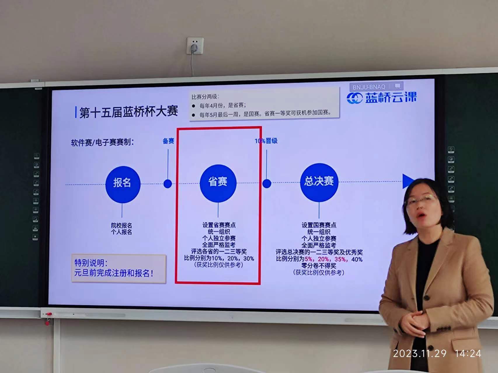 程立就计算机大赛在专业评估中的作用、对学生能力、教学质量的提升进行了介绍,详细解读了“ICPC”、“CCPC”、“蓝桥杯”、“天梯榜”等竞赛的重要性及突破点。分别从竞赛项目的起步、过程把控、注意事项等环节入手,介绍了参赛项目的学科类别、选题、训练方式以及参赛作品的形式与要求。