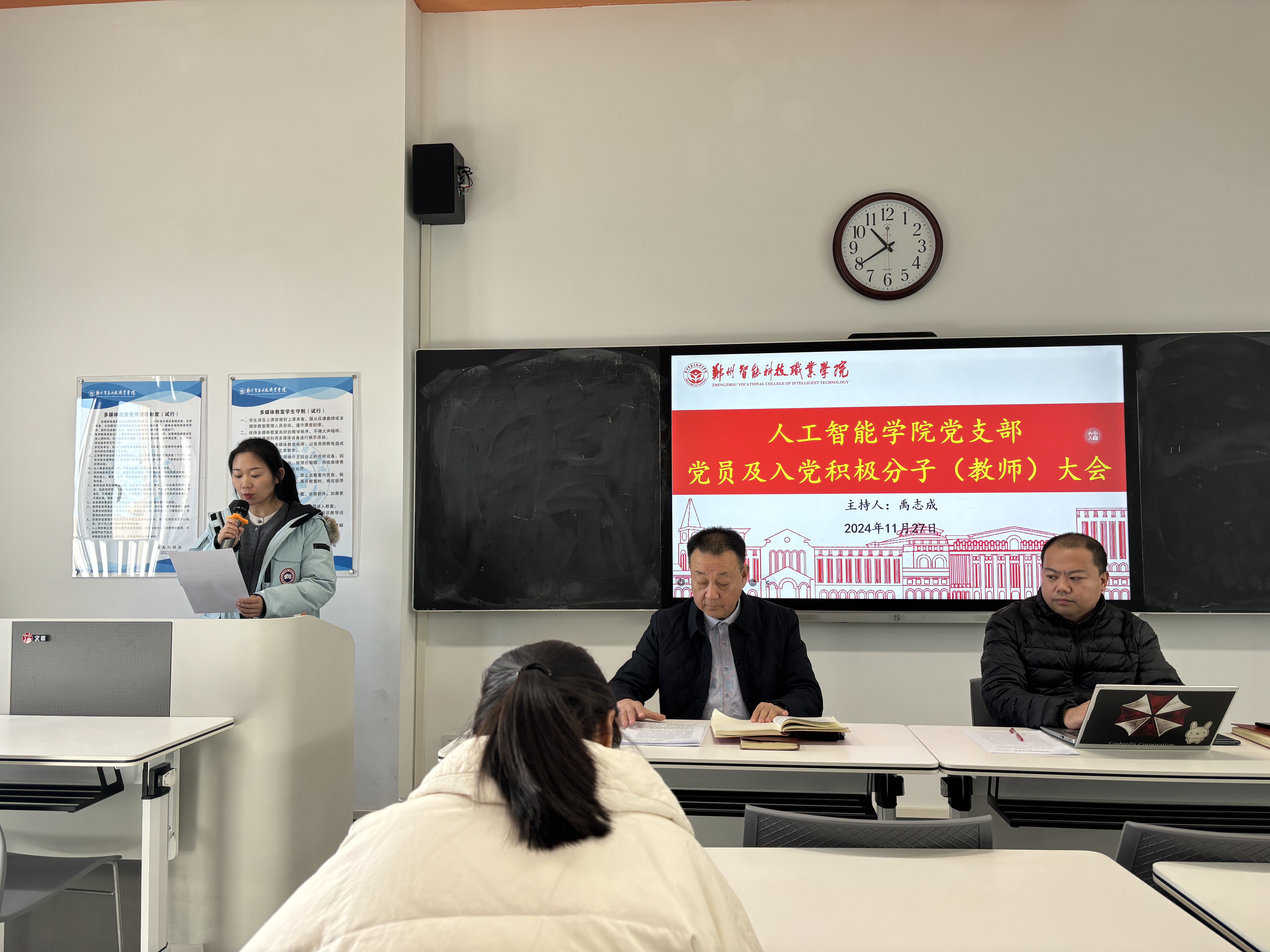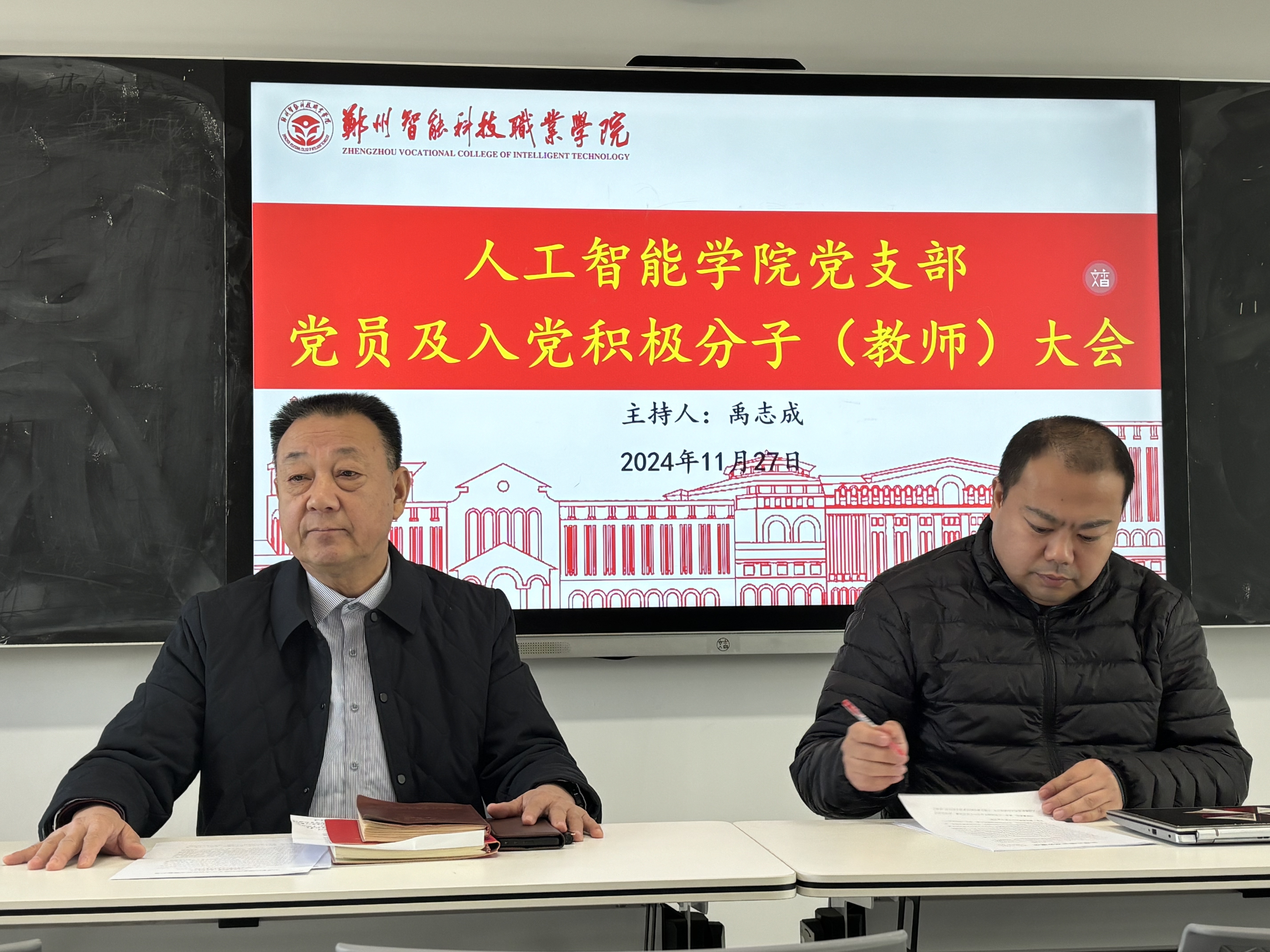 发布日期:2024-12-03 访问次数:11月27日下午,人工智能学院党支部召开支部党员及教师入党积极分子专题会议,人工智能学院领导班子成员、全体党员及学院教师入党积极分子参加会议,会议由人工智能学院党支部书记禹志成主持。