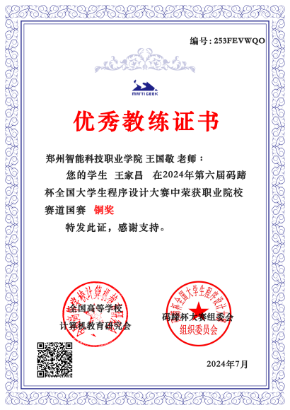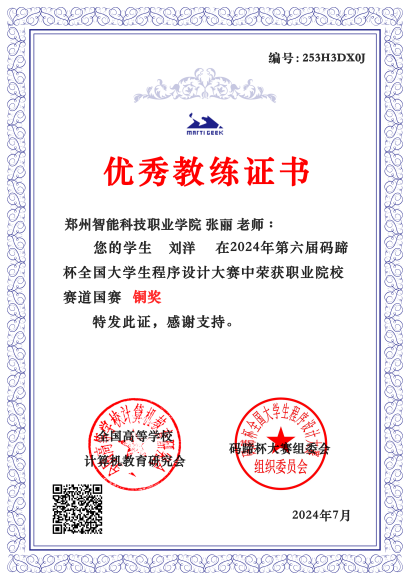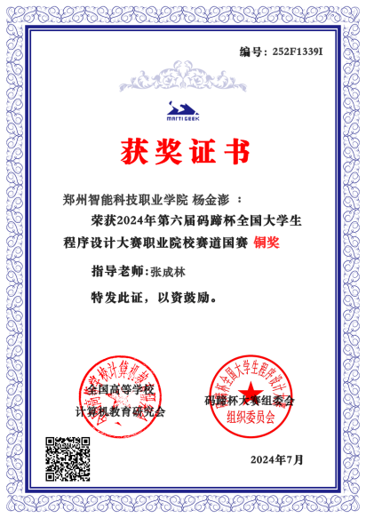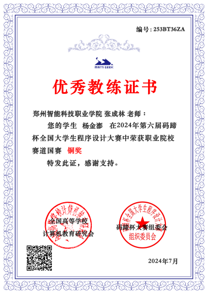 发布日期:2024-07-30 访问次数:近日,2024年“码蹄杯全国大学生程序设计大赛”全国总决赛成绩揭晓。我们人工智能学院6名学生在张丽、张成林等指导老师的带领下,凭借出色的表现,获得了全国铜奖3项的优异成绩。这是我们学生首次在教育部认可的大学生学科竞赛正式赛项获奖,是学科竞赛成绩的一次新突破。