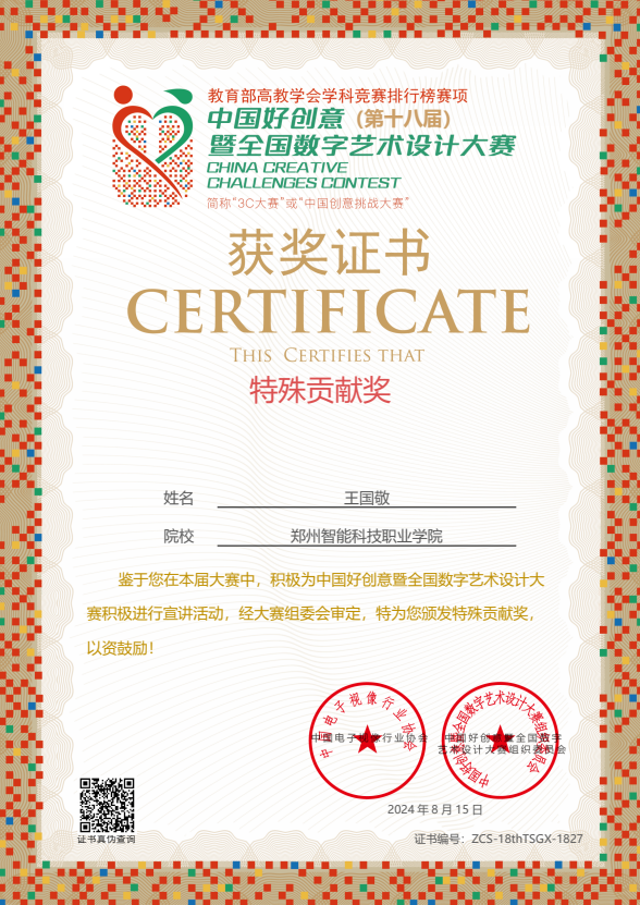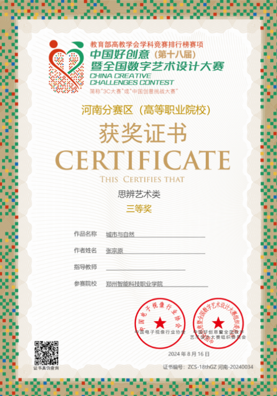 发布日期:2024-08-27 访问次数:近日,随着2024年第18届中国好创意暨全国数字艺术设计大赛落下帷幕,获奖名单揭晓。我们人工智能学院2022级计算机应用技术专业的张宗原同学,在专任教师史志文、辅导员宋佳慧的指导下,凭借着出色的表现,荣获《思辨艺术类》河南高职赛道三等奖。人工智能学院王国敬老师,积极参与组织参赛工作,荣获大赛组织委员会颁发的特殊贡献奖。