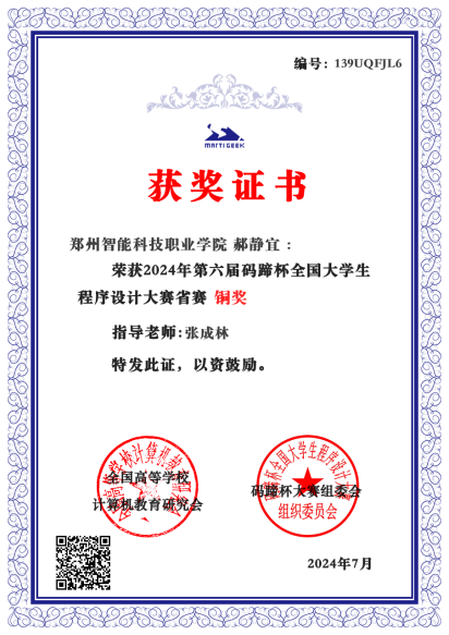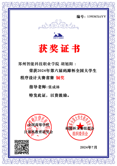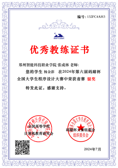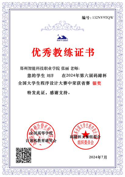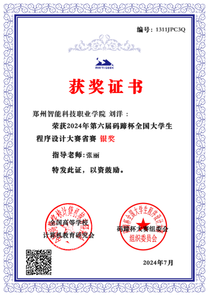 近日,备受瞩目的第六届“码蹄杯全国大学生程序设计大赛”省赛圆满落下帷幕。经过激烈的角逐,我们人工智能学院6名学生在张丽、张成林两位教师的带领下,有9名同学参加大赛,其中6名同学分别荣获:省级银奖3项,铜奖3项,该6名同学全部进入全国总决赛。这6名同学将会代表我们参加在7月中旬举办的“码蹄杯”国赛,以下为部分证书: