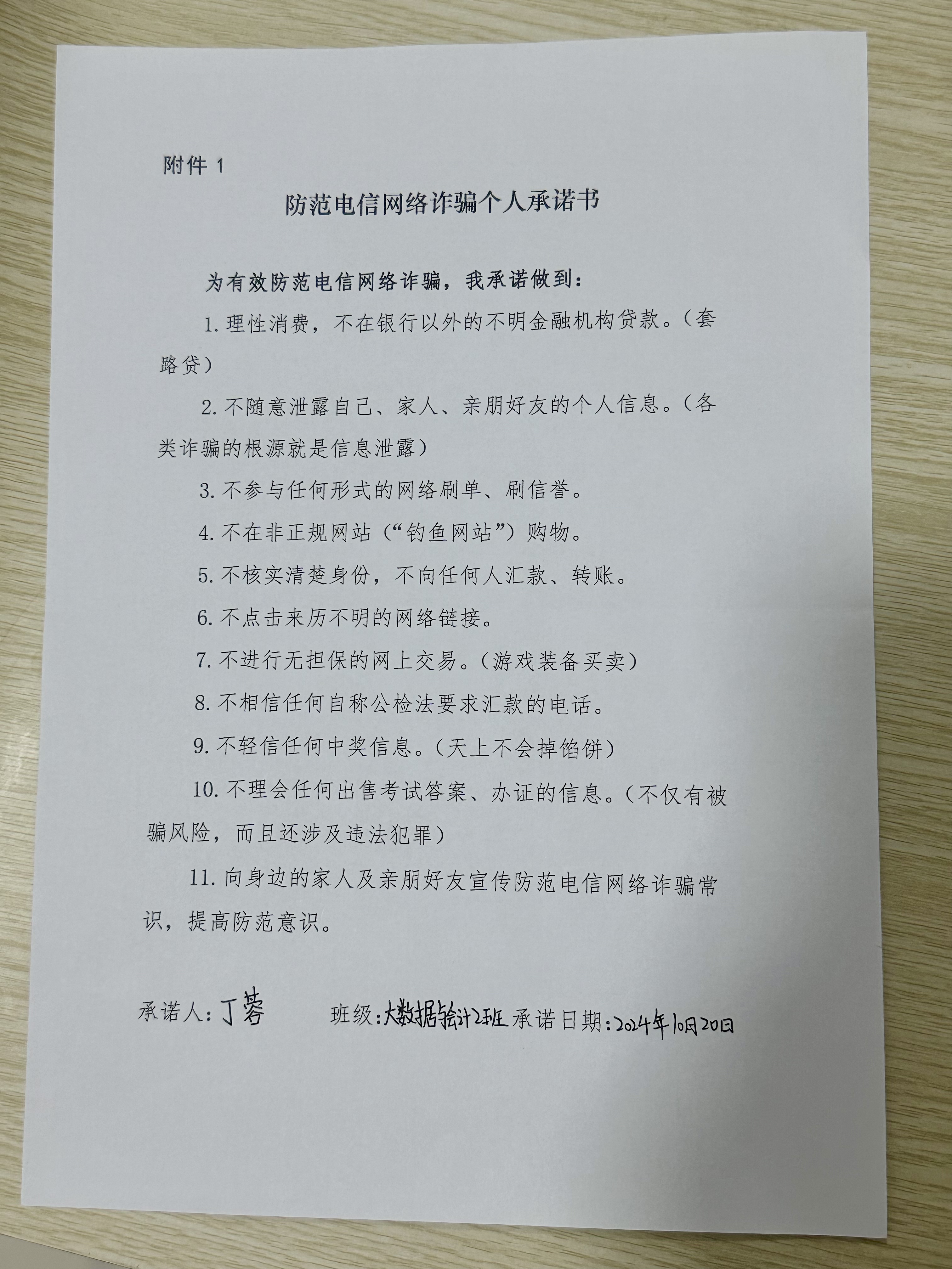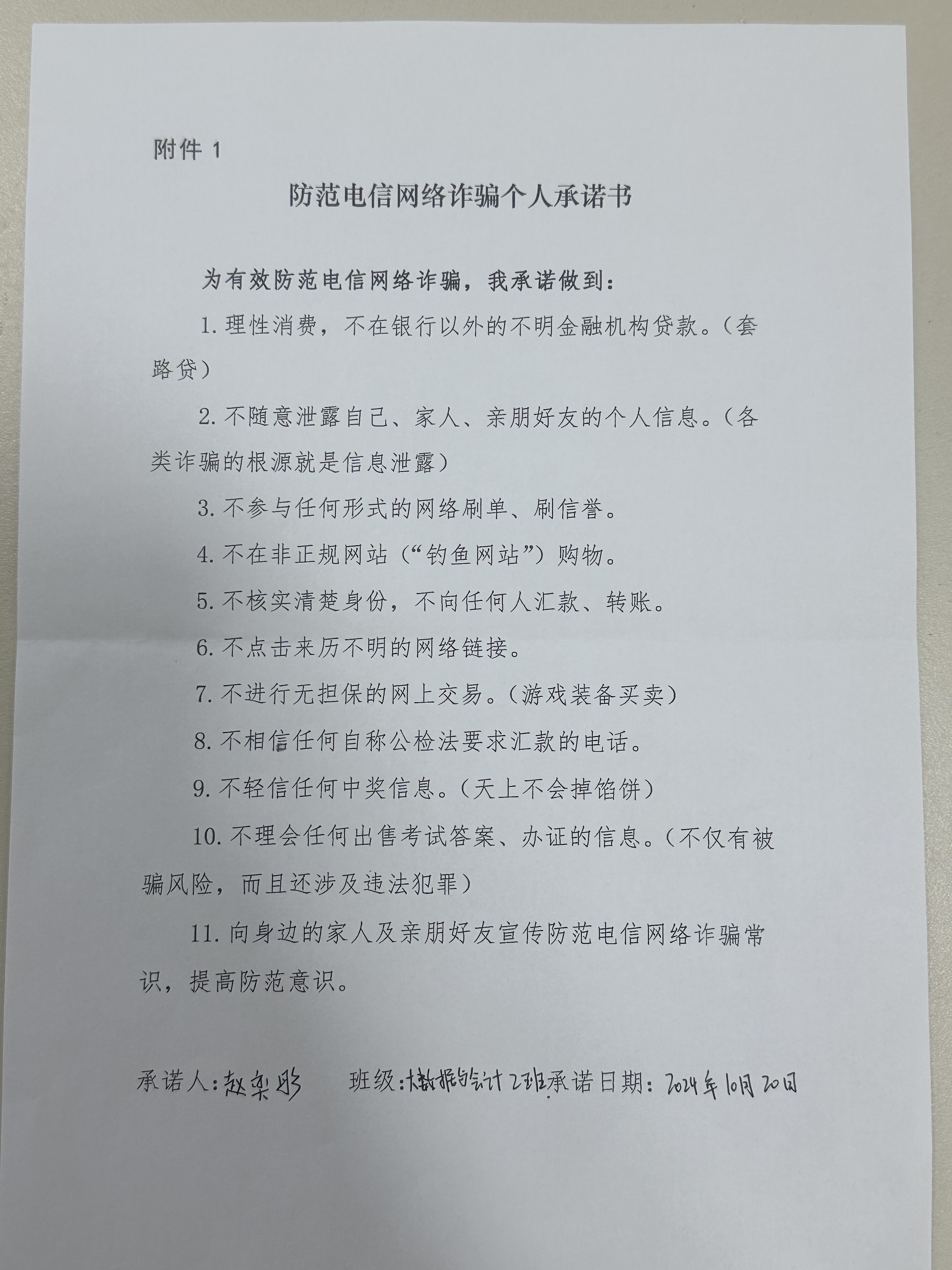班会过程中,学生们积极参与讨论,并从中认识到了电信诈骗的严重性和危害性。一些学生还分享了自己或身边人遇到的诈骗经历,进一步增强了大家的防范意识。会后,同学们签署了《防电信诈骗个人承诺书》,并现场下载了国家反诈中心APP,同学们纷纷表示会向身边的家人朋友宣传相关反诈常识,为全民反诈贡献自己的力量。