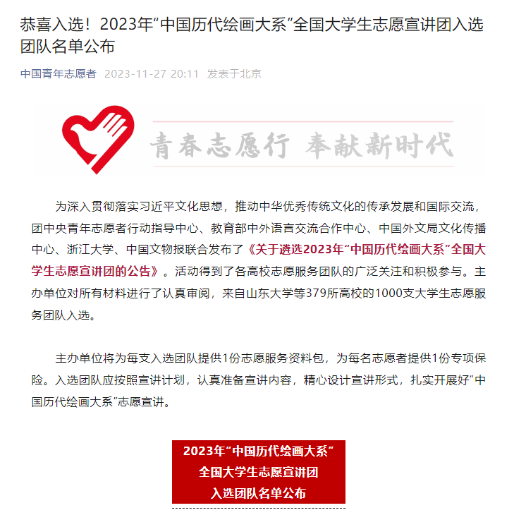 11月27日,团中央青年志愿者行动指导中心、教育部中外语言交流合作中心、中国外文局文化传播中心、浙江大学、中国文物报联合公布2023年“中国历代绘画大系”全国大学生志愿宣讲团入选团队名单。我们学生志愿团队成功入选。