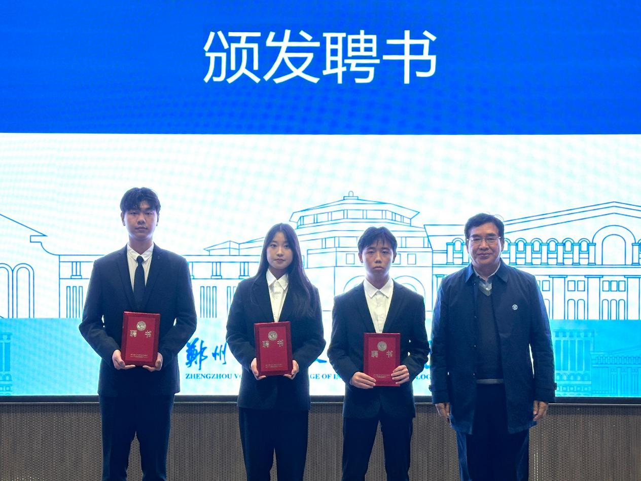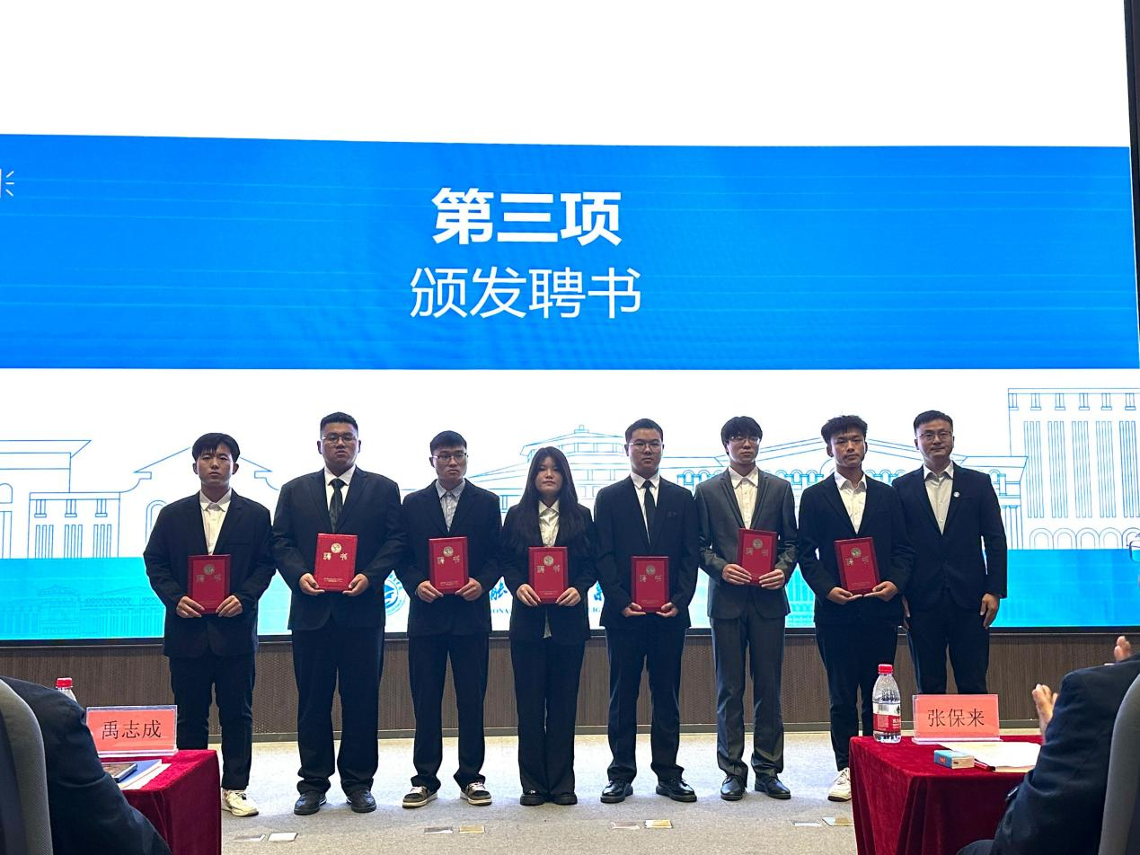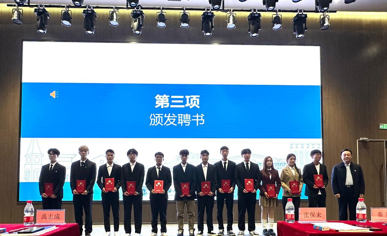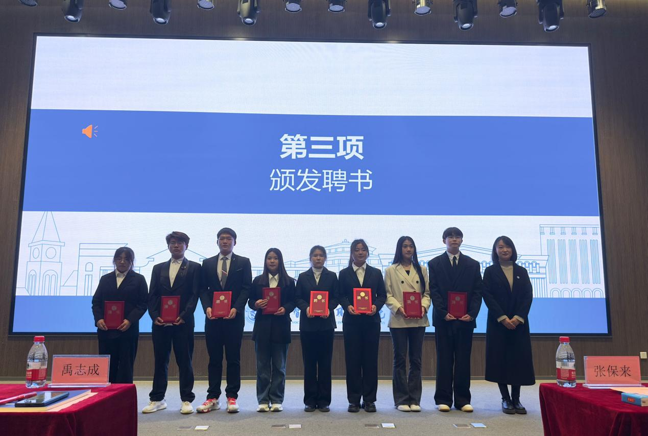 会议上,校团委张清淼宣布主席团及各部门负责人聘用名单,副校长张保来、学生工作处处长秦鹏、学管副院长禹志成、石冰清分别为学生干部颁发聘书。