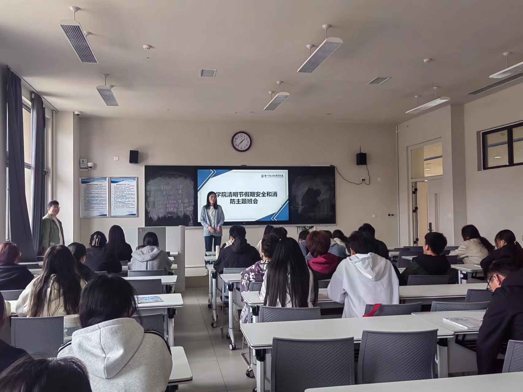 班会上,辅导员传达了学校关于做好清明假期离校及学生安全教育工作的相关内容,围绕离校安全、宿舍安全、食品安全、交通安全、消防安全、防诈骗等多个方面,分析了安全隐患并展开讲解注意事项,强调学生离校前要做好宿舍安全检查工作,做好假期离校登记,携带好个人贵重物品,关好水电门窗,返乡途中要注意人身安全、财产安全和交通安全。
