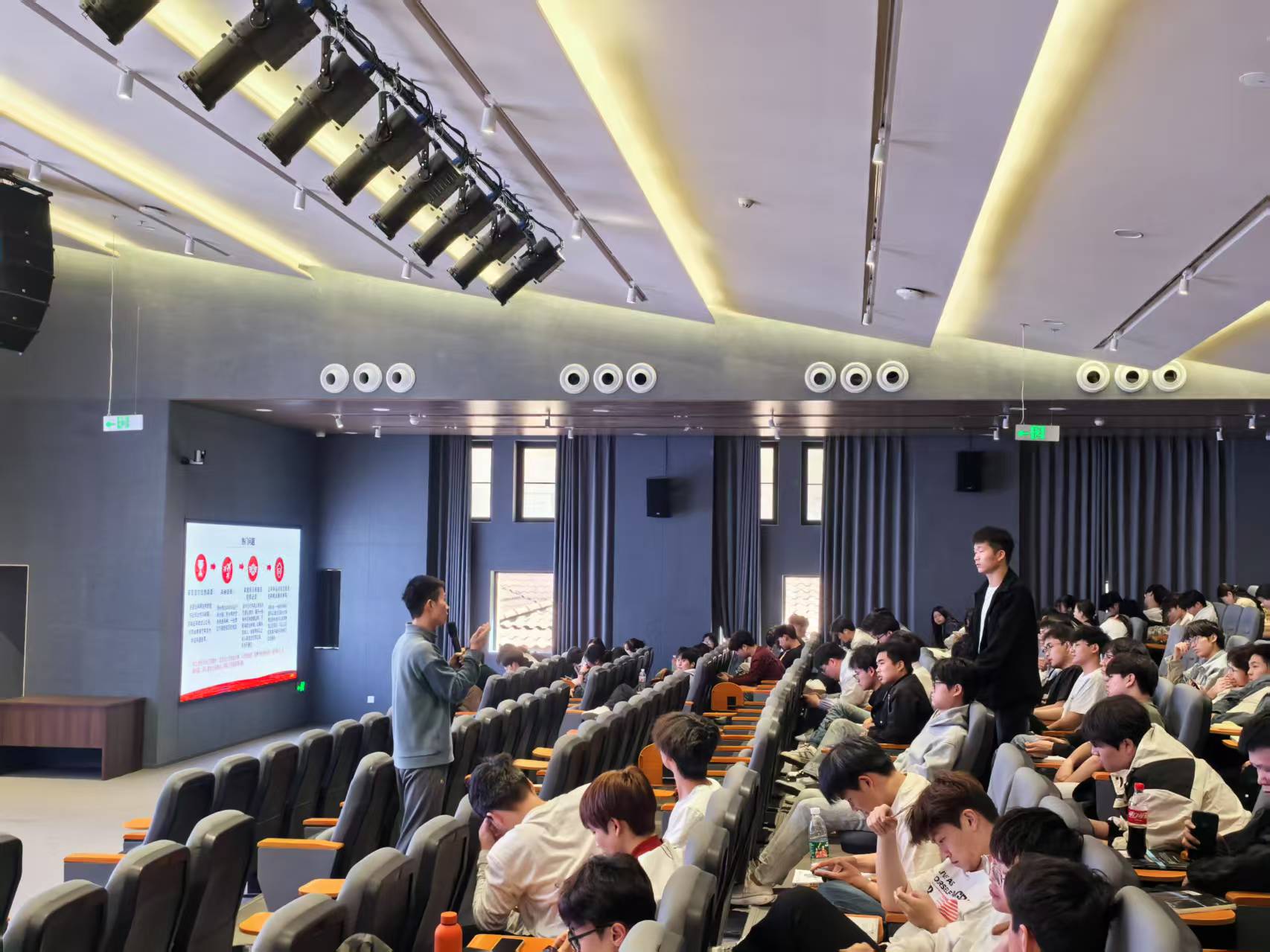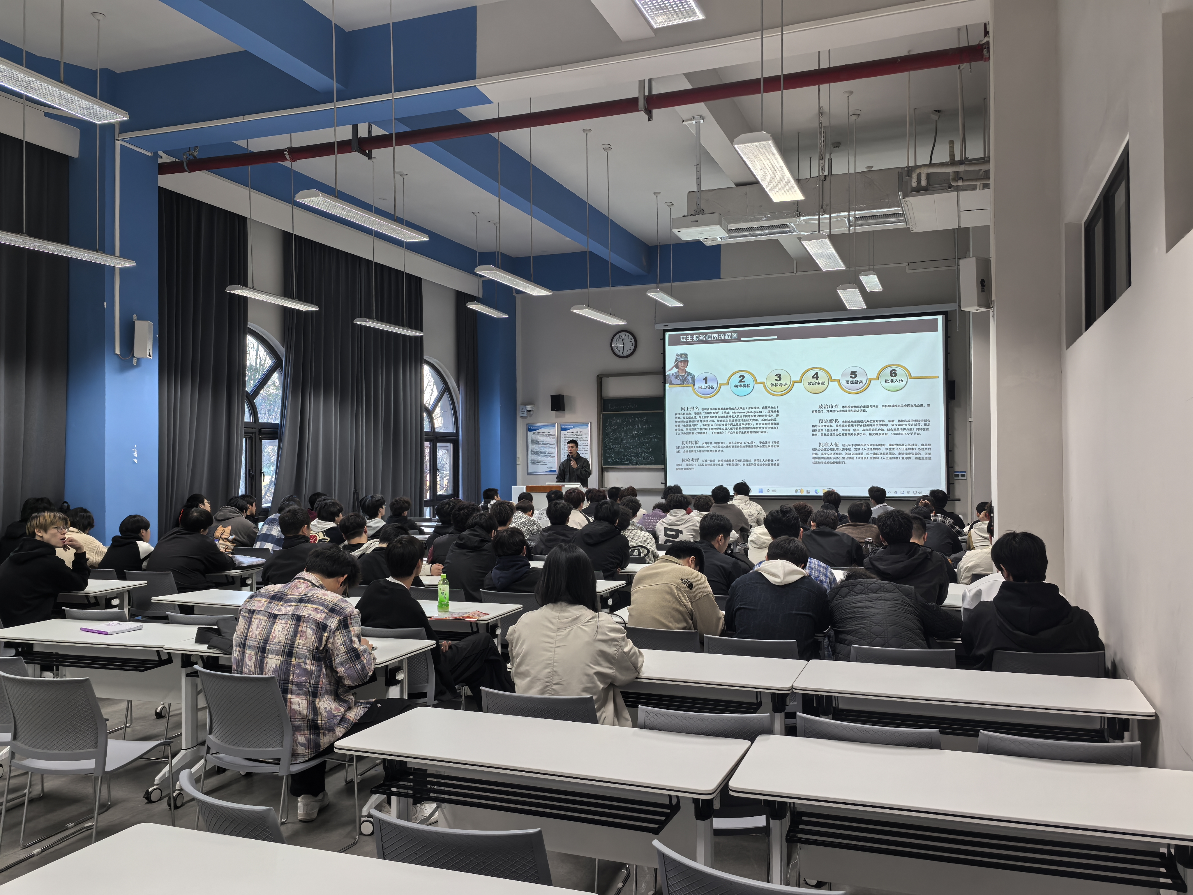 宣讲会上,校武装部张斌老师结合自身从军经历,为同学们详细解读了大学生入伍政策。宣讲内容涵盖报名流程、体检标准、学籍保留、学费补偿等学生关切的热点问题,特别针对应征入伍报名流程和体检政审相关注意事项,进行详细讲解。