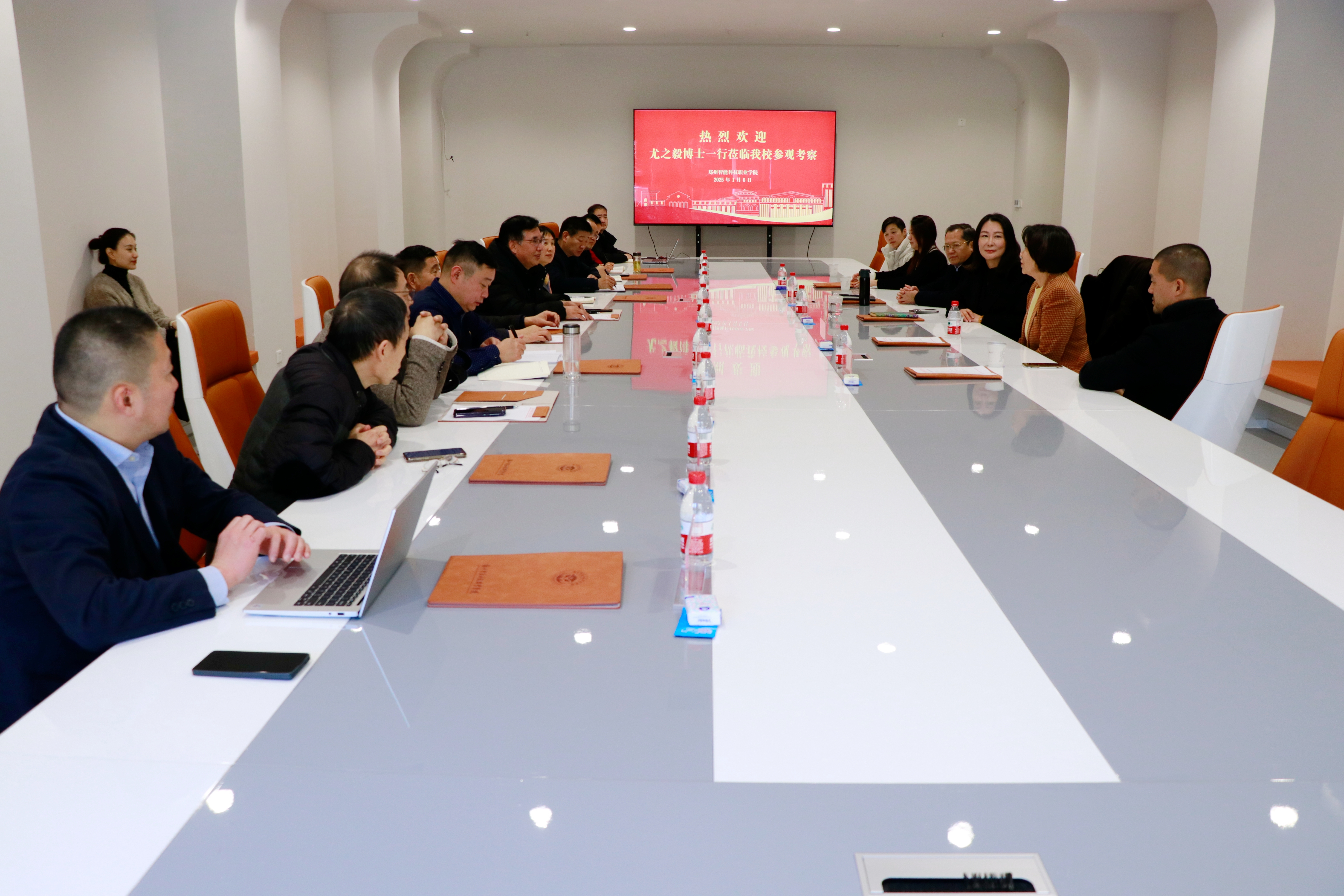在参观了我们一站式学生社区服务中心、教学楼、图书馆、实训室、艺术中心AI艺术走廊等场所后,双方在艺术中心会议室召开座谈会。